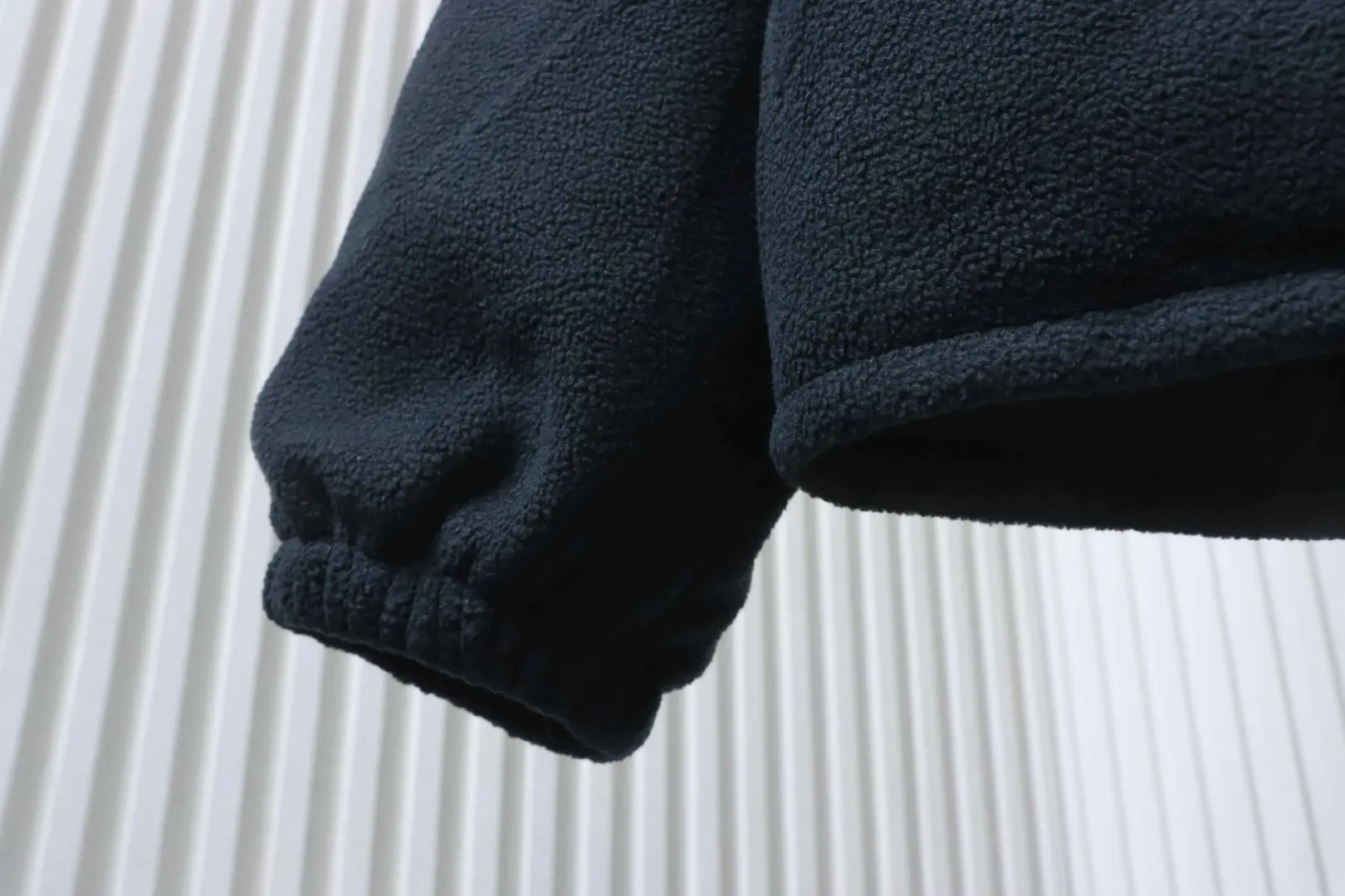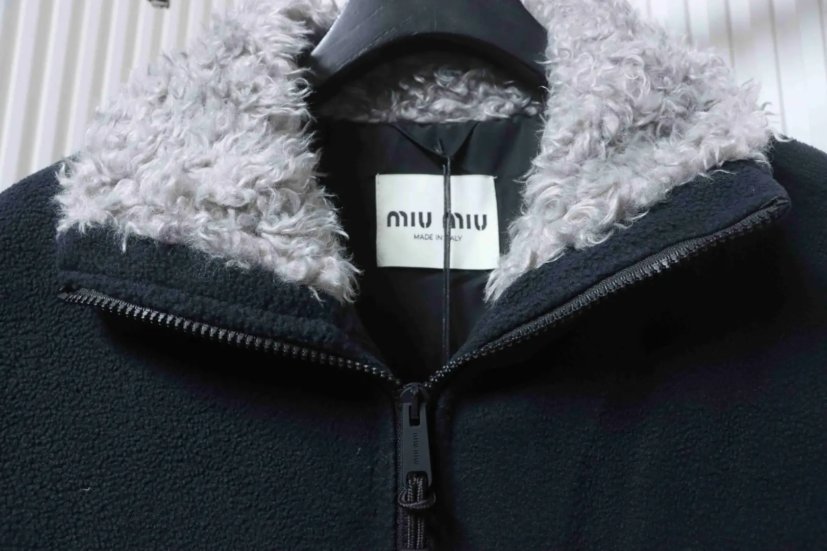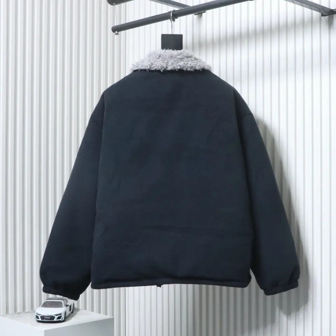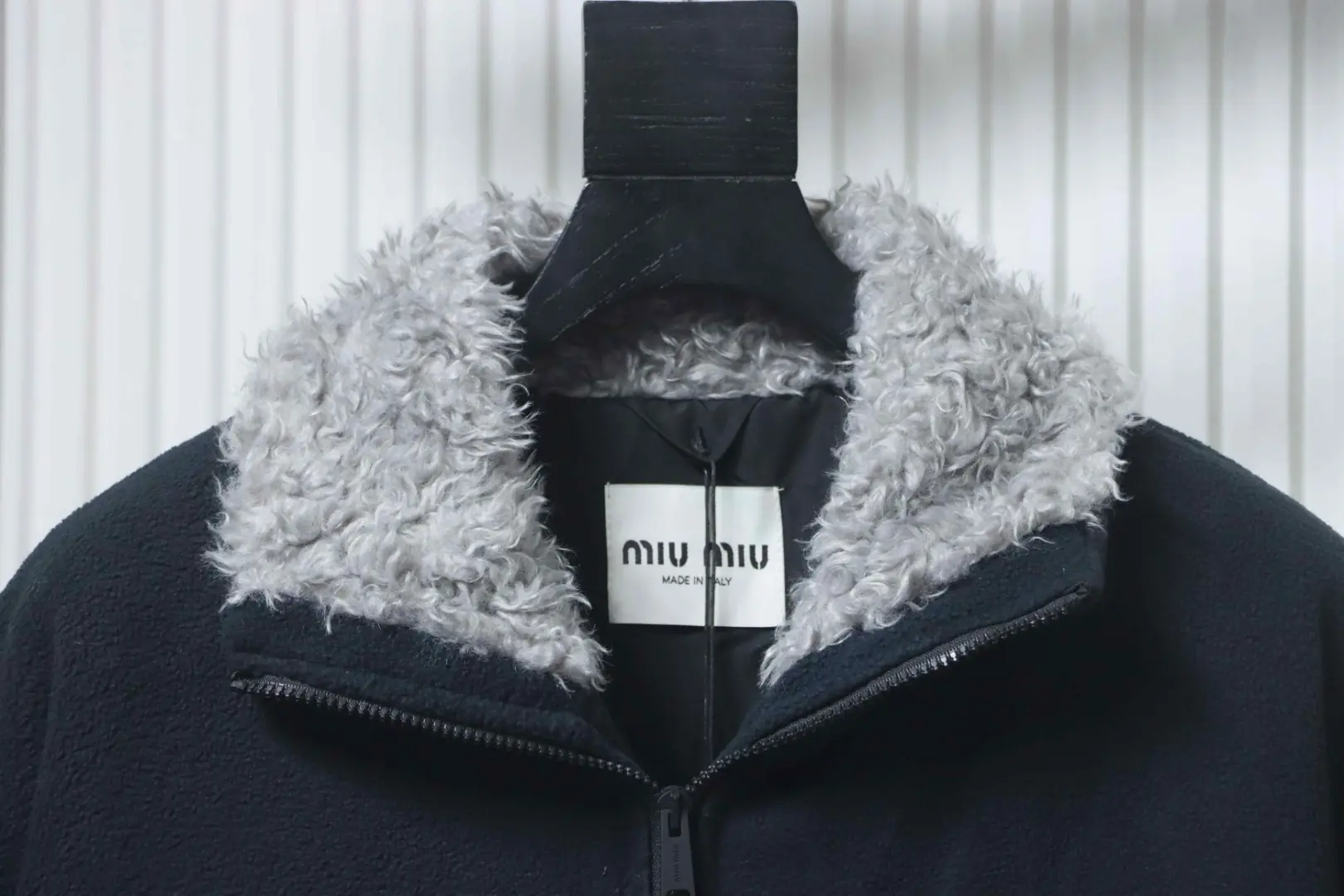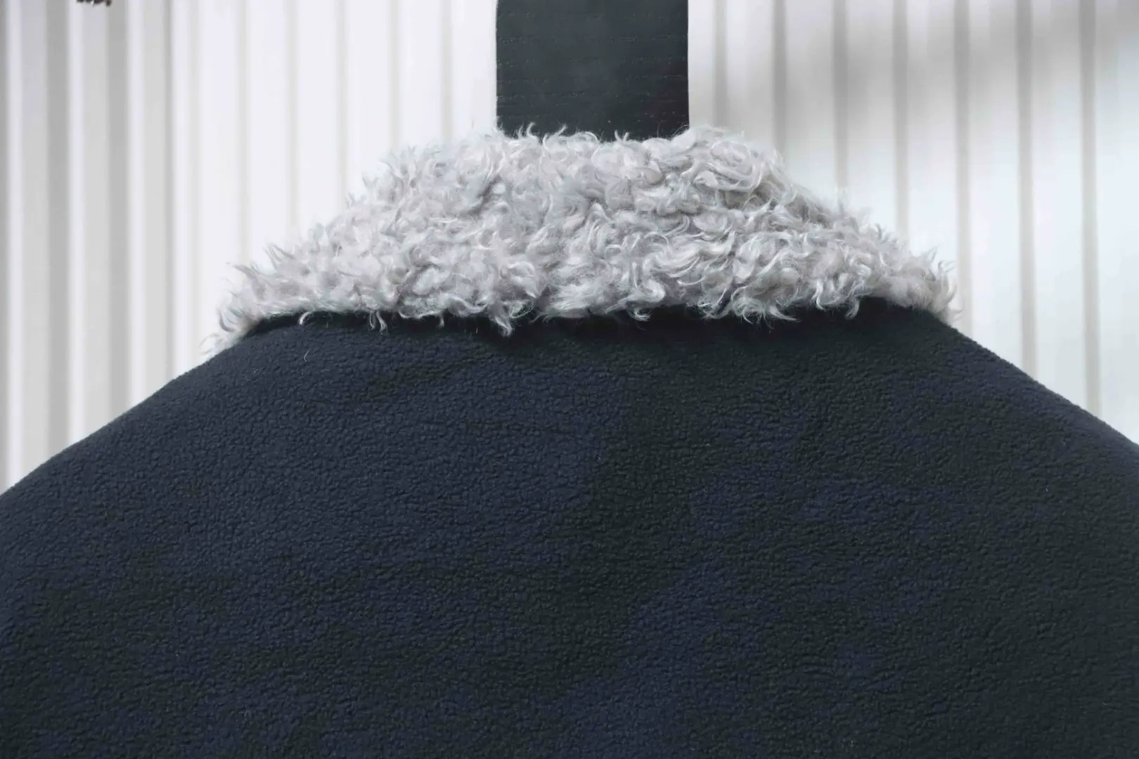 -59%- Maßgefärbtes marineblaues Fleece; maßgefertigter Kragen aus grauem Lammwollstoff.