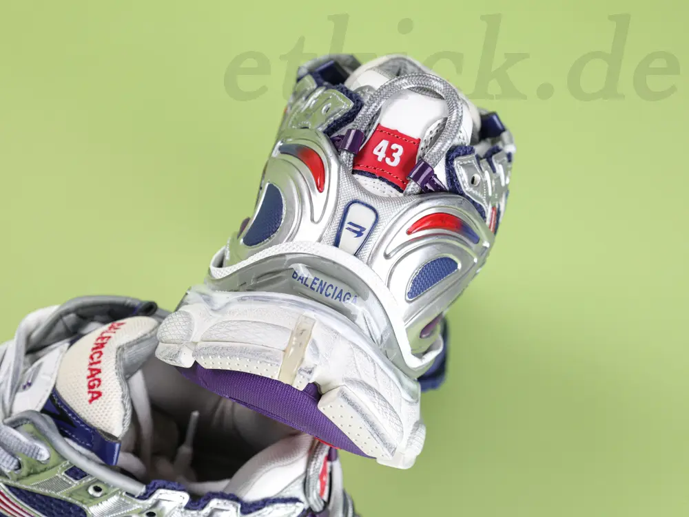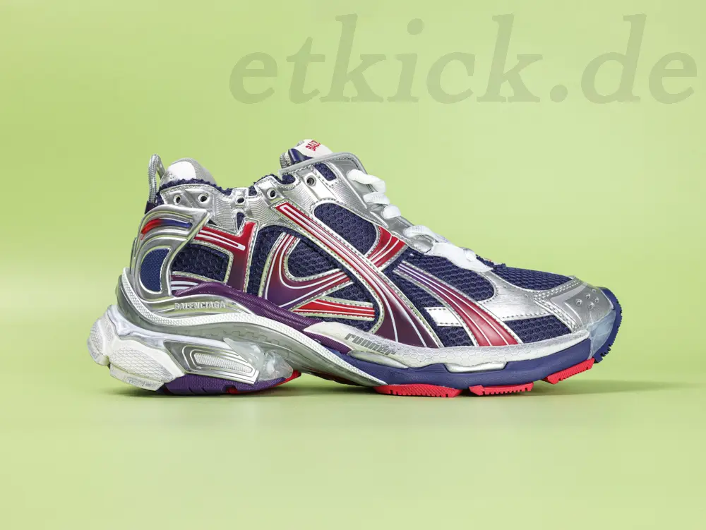 Balenciaga präsentiert diesen Herren-Laufschuh mit Farbverlauf. Die übereinanderliegenden Farben Marineblau, Rot und Grau erzeugen eine einzigartige visuelle Wirkung und vereinen so perfekt sportliche Eigenschaften mit modischer Ästhetik.