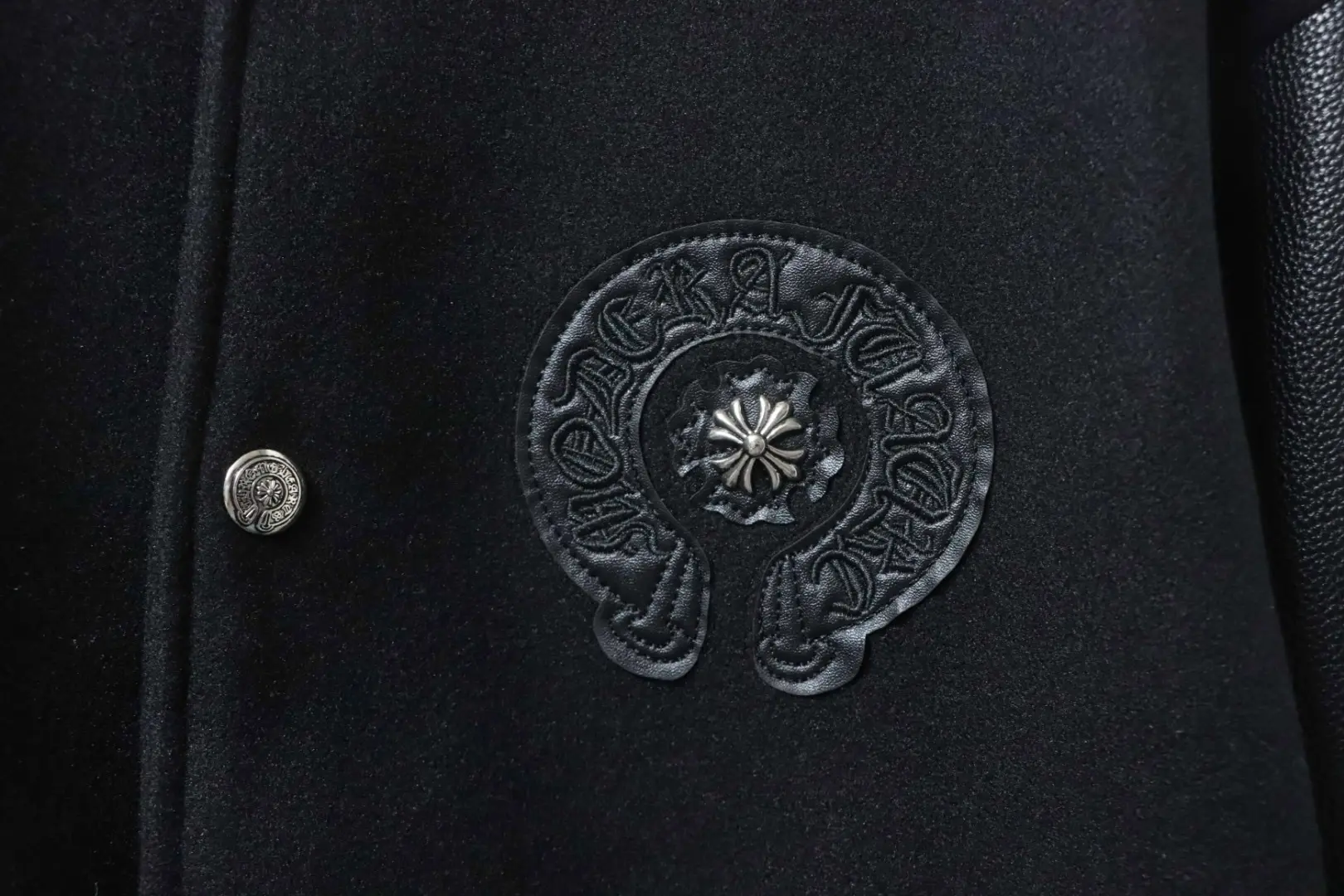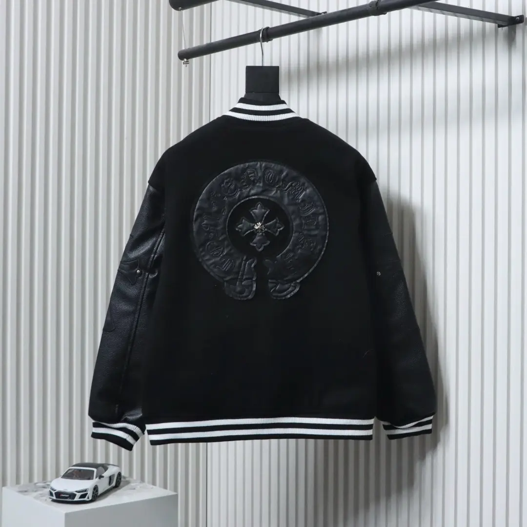 Baseballjacke aus Leder mit Kreuzmuster und mehreren Markenlogos an den Ärmeln XXL