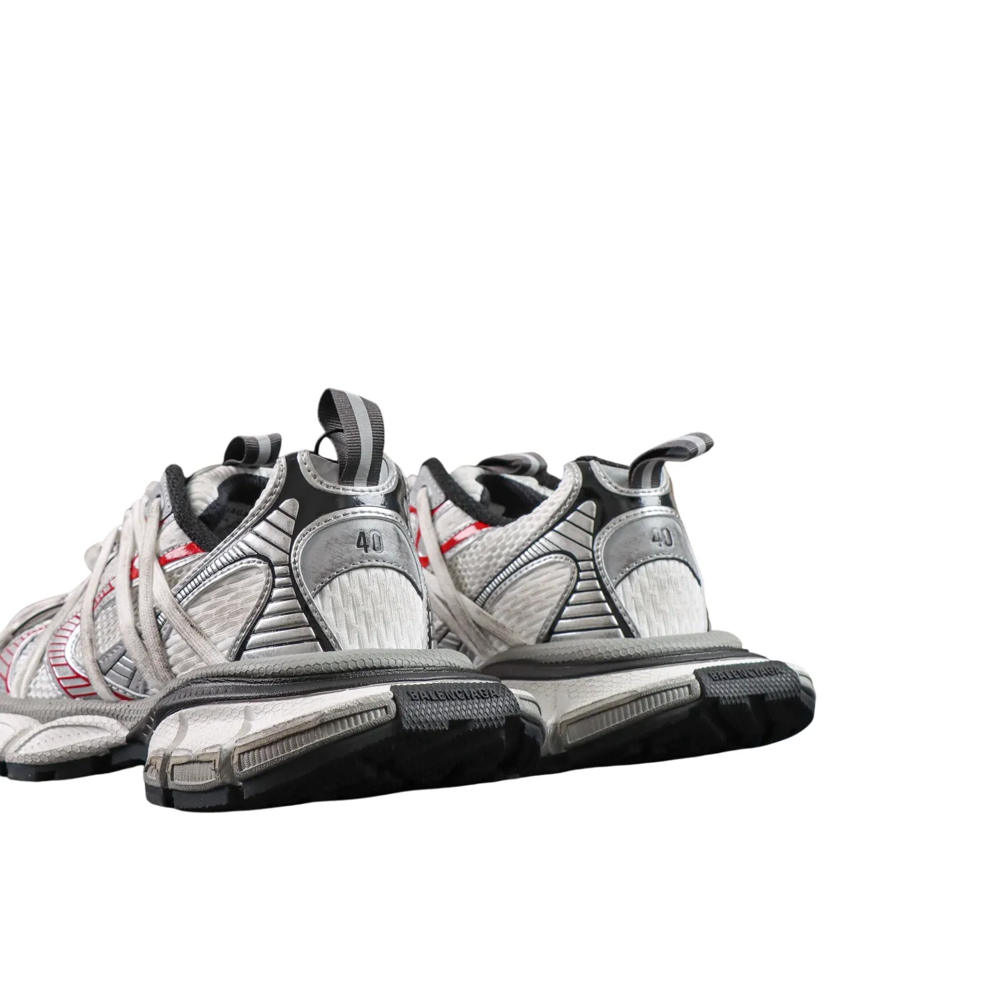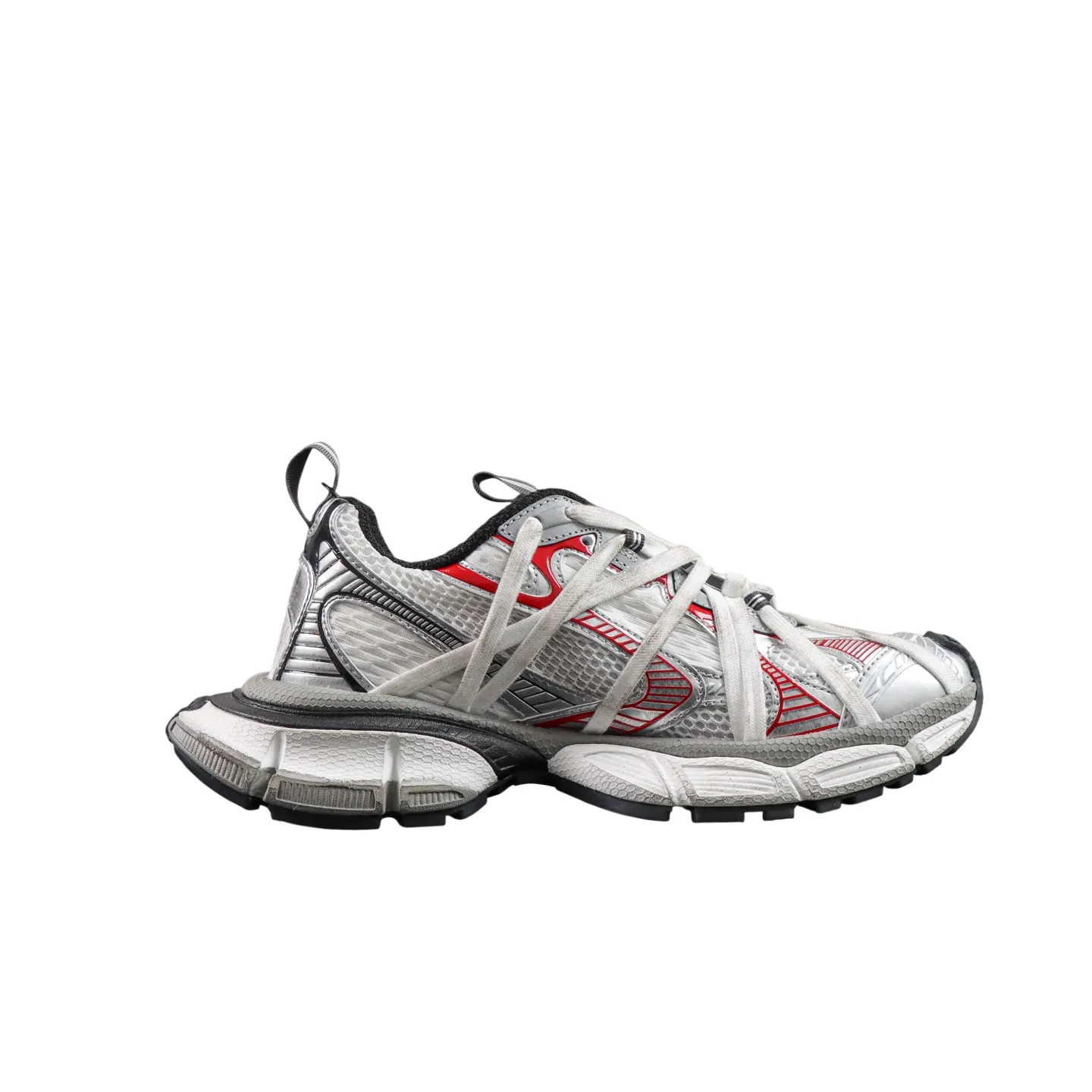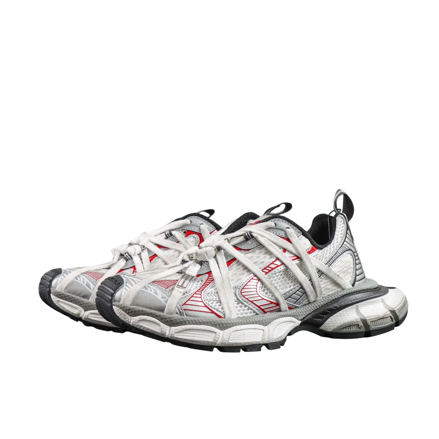 Werten Sie Ihre Streetwear mit dem Balenciaga 3XL Extreme Laces B in Silbergrau und Rot auf. Dieser moderne Dad Shoe vereint die markante Silhouette des Balenciaga Runner mit einem leichten Design und einer breiten, konvexen Sohle für extra Höhe ohne schweres Gewicht. Dank weicher Schaumstoff-Technologie bietet er ganztägigen Komfort und wird für ein erstklassiges Erlebnis in der originalgetreuen Box geliefert.