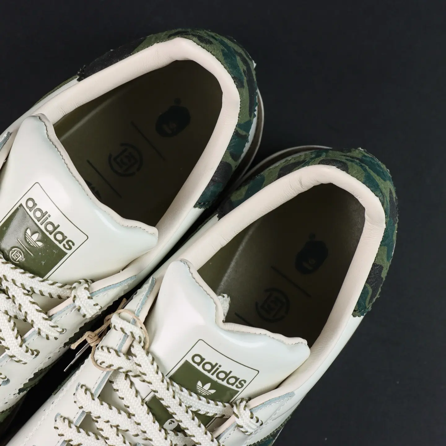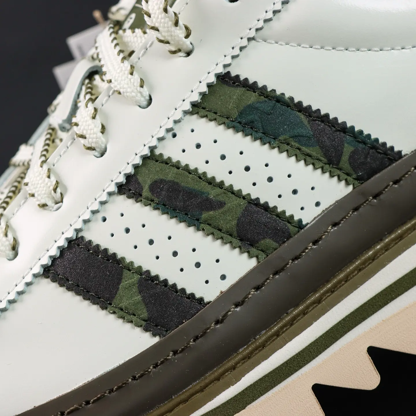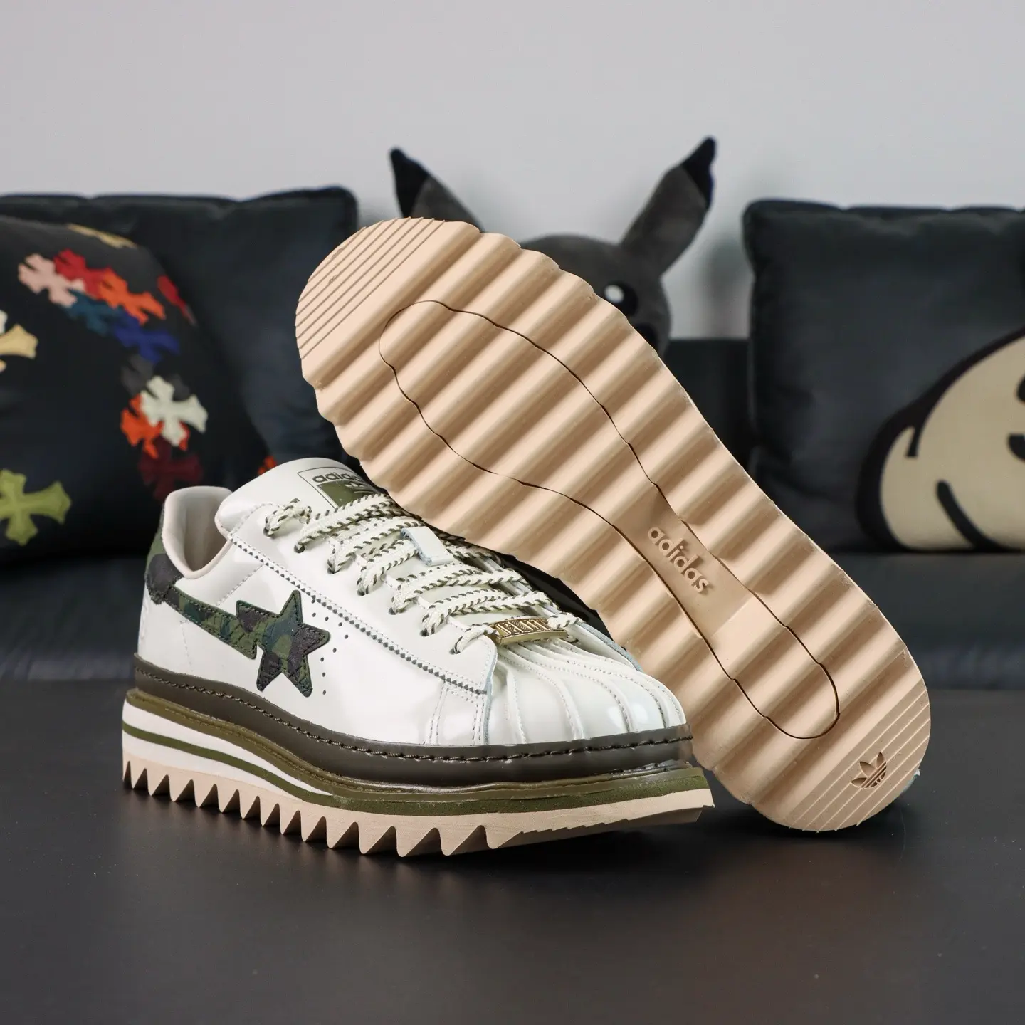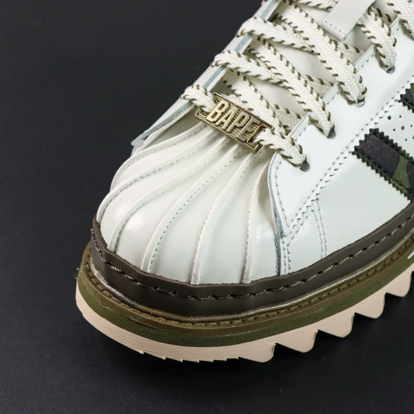 Der CLOT x BAPE® Superstar von Edison Chen Off White & Branch & Olive basiert auf dem klassischen „Superstar“-Design und interpretiert die ikonische Zehenkappe neu. Die Zunge zieren einzigartige Quasten mit den Logos beider Marken, die die Zusammenarbeit unterstreichen. Das absolute Highlight ist die Sohle: Neben einer Zwischensohle für zusätzliche Höhe besticht sie durch ein markantes „Haifisch-Zackenmuster“, das für maximale Wiedererkennbarkeit sorgt.