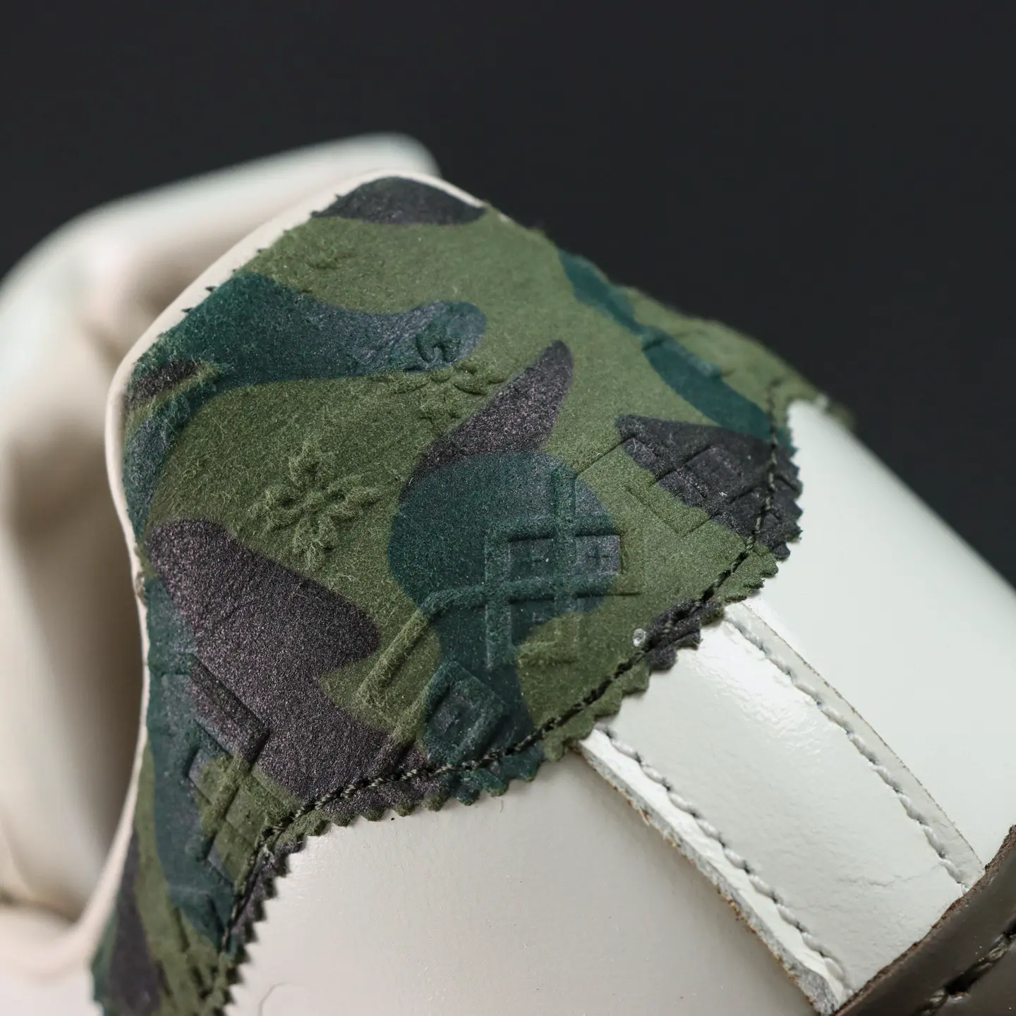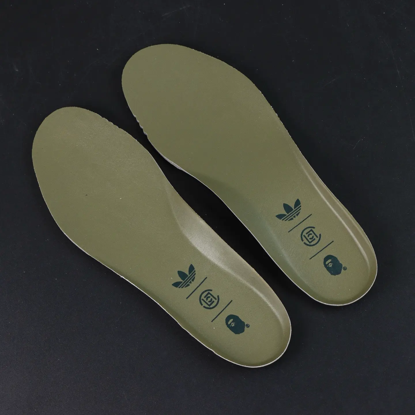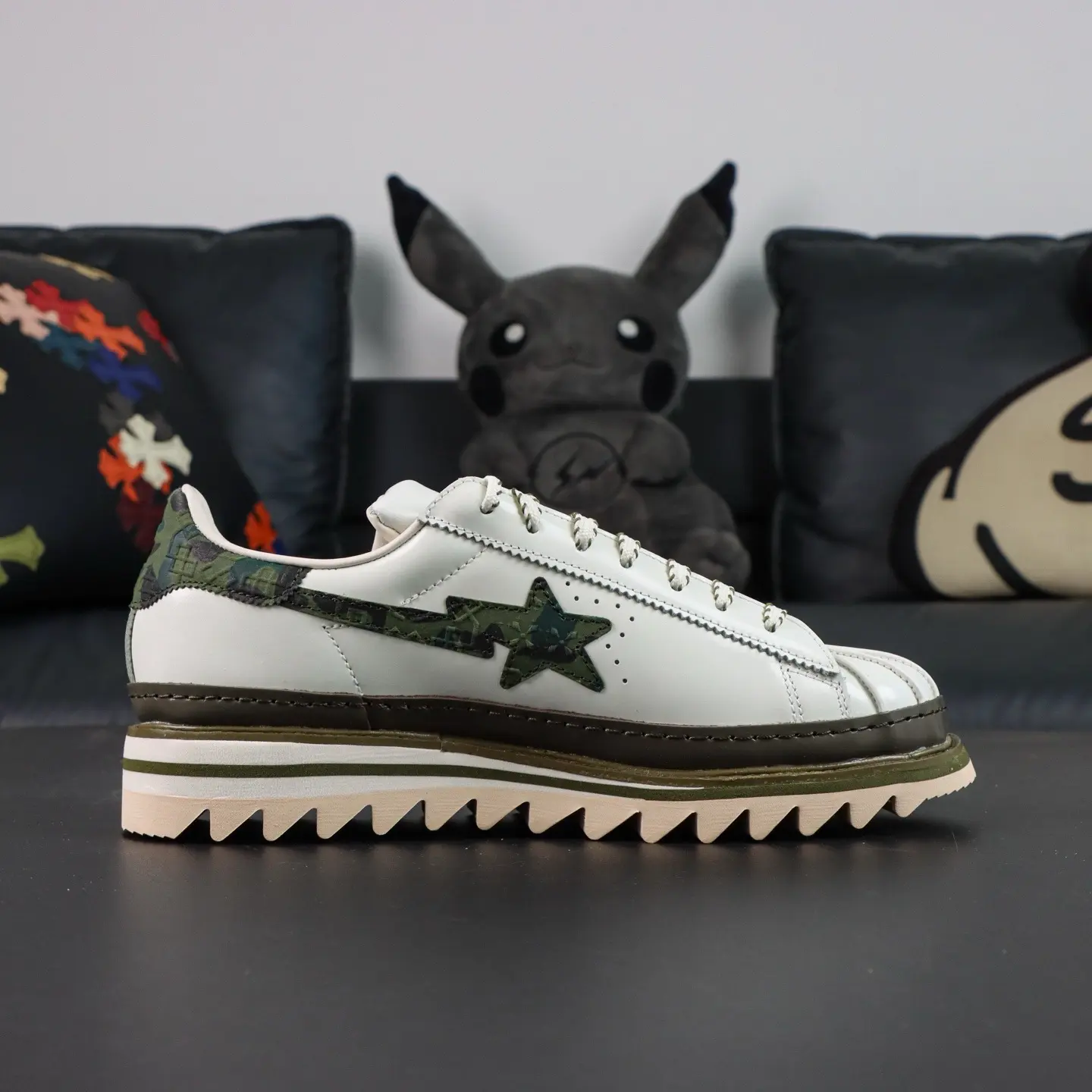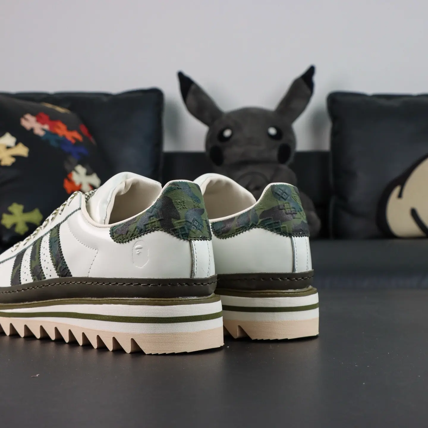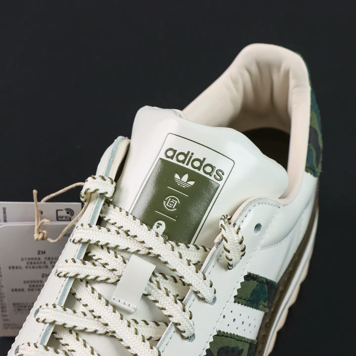 Der CLOT x BAPE® Superstar von Edison Chen Off White & Branch & Olive basiert auf dem klassischen „Superstar“-Design und interpretiert die ikonische Zehenkappe neu. Die Zunge zieren einzigartige Quasten mit den Logos beider Marken, die die Zusammenarbeit unterstreichen. Das absolute Highlight ist die Sohle: Neben einer Zwischensohle für zusätzliche Höhe besticht sie durch ein markantes „Haifisch-Zackenmuster“, das für maximale Wiedererkennbarkeit sorgt.