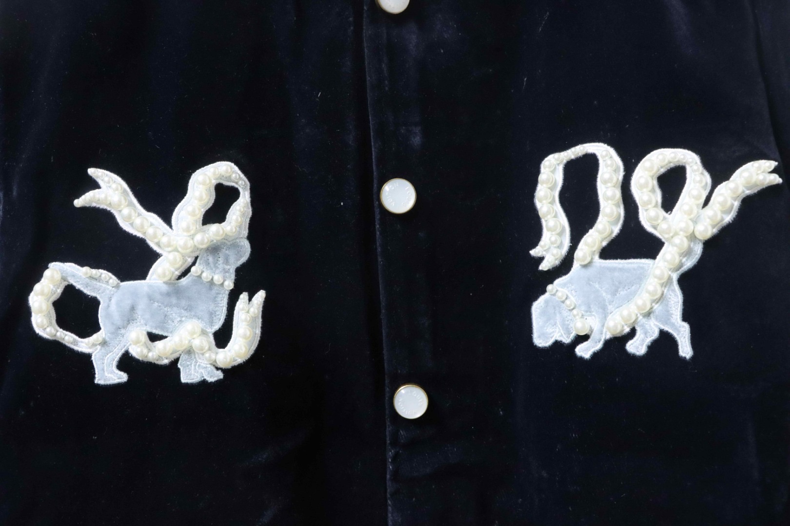-24%- Inspiriert von der Kleidung der Westminster-Hundebesitzer präsentiert sich diese Yokosuka-Jacke mit einem leuchtenden Dogs-Logo auf glänzendem Samt und einem perlenbestickten Hundeabzeichen.