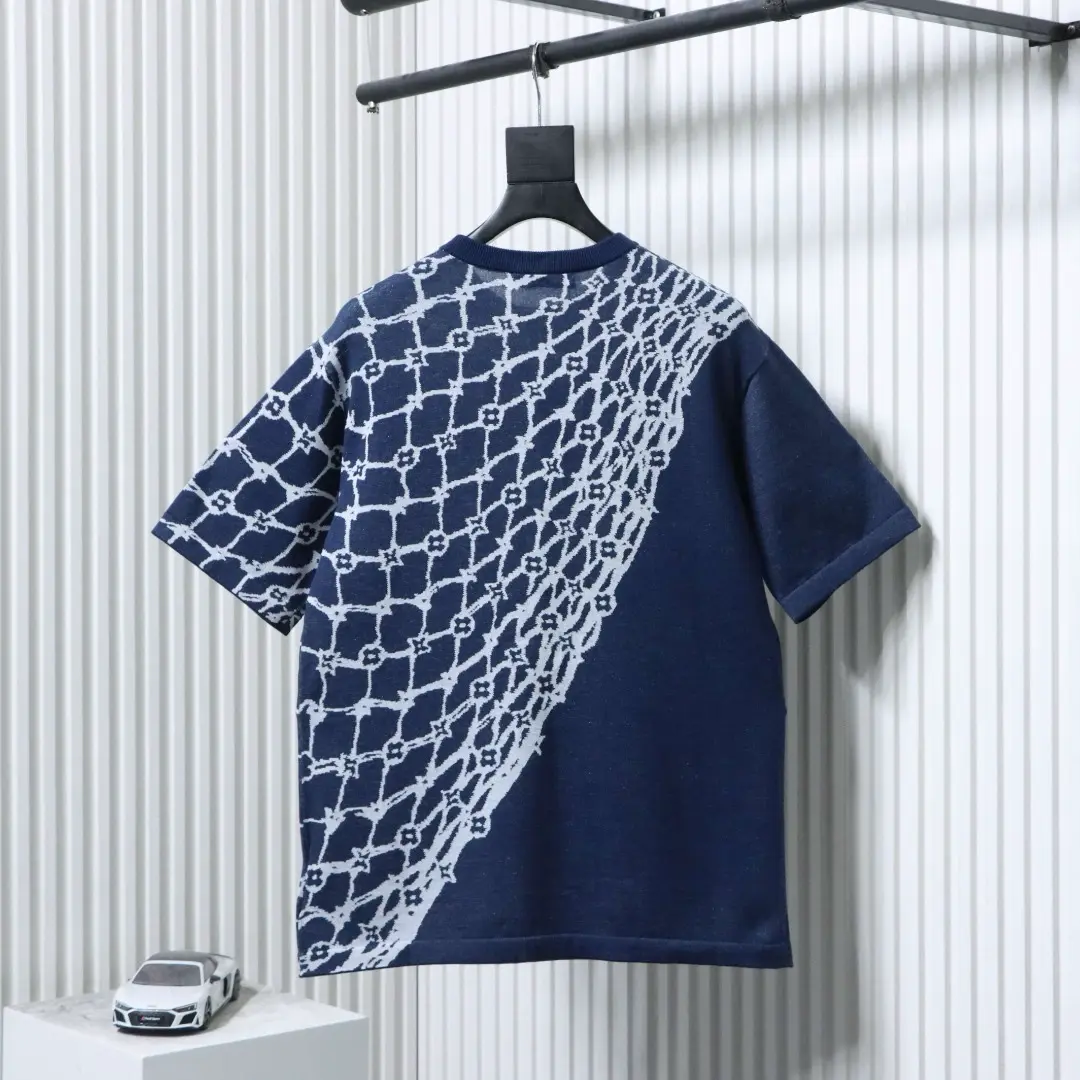 -47%- Dieses kurzärmelige Baumwoll-Top mit Rundhalsausschnitt besticht durch sein durchgehendes Monogram Fishnet Jacquard-Gewebe. Das unregelmäßige Muster erinnert an sanft gewellte blaue Wellen und greift das maritime Thema der Saison auf.