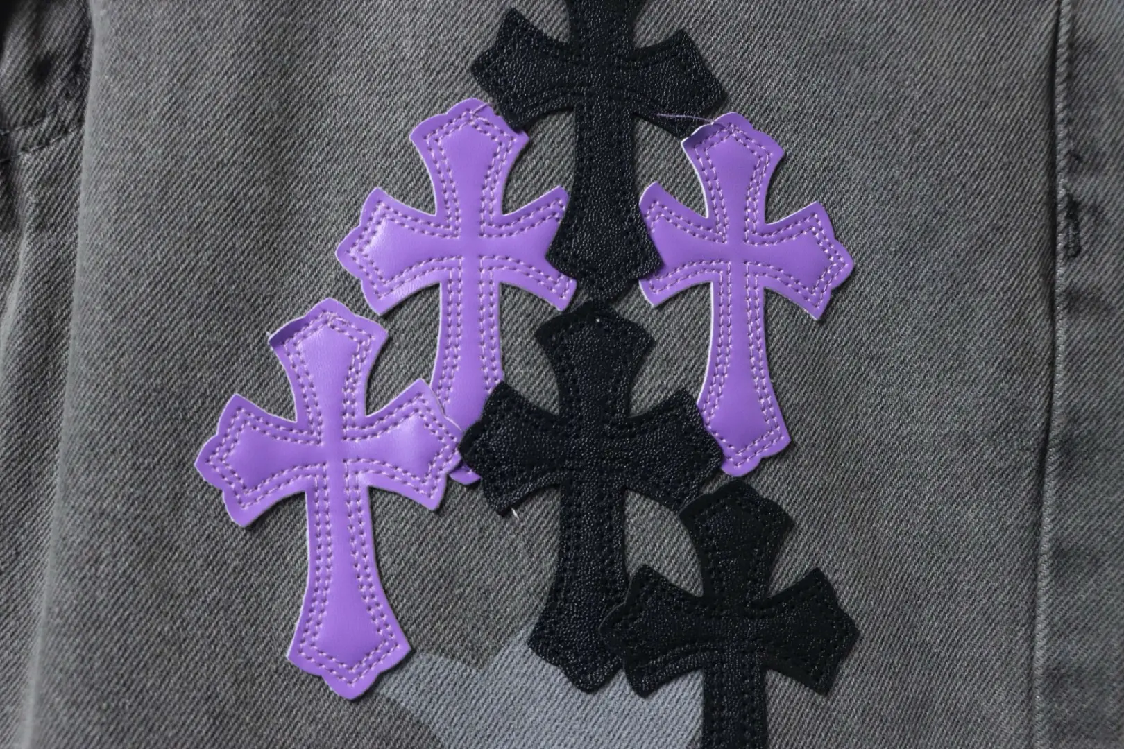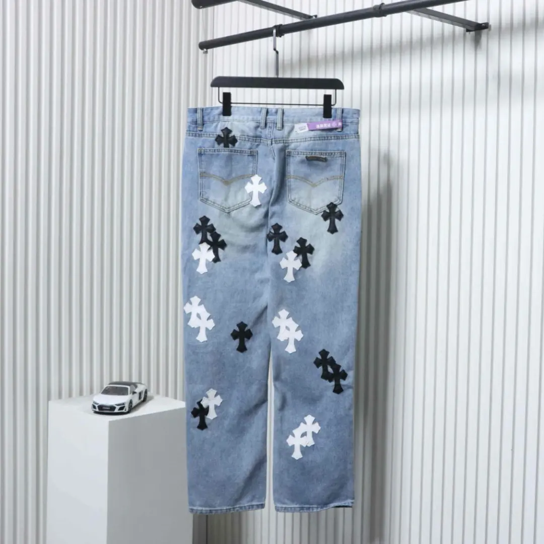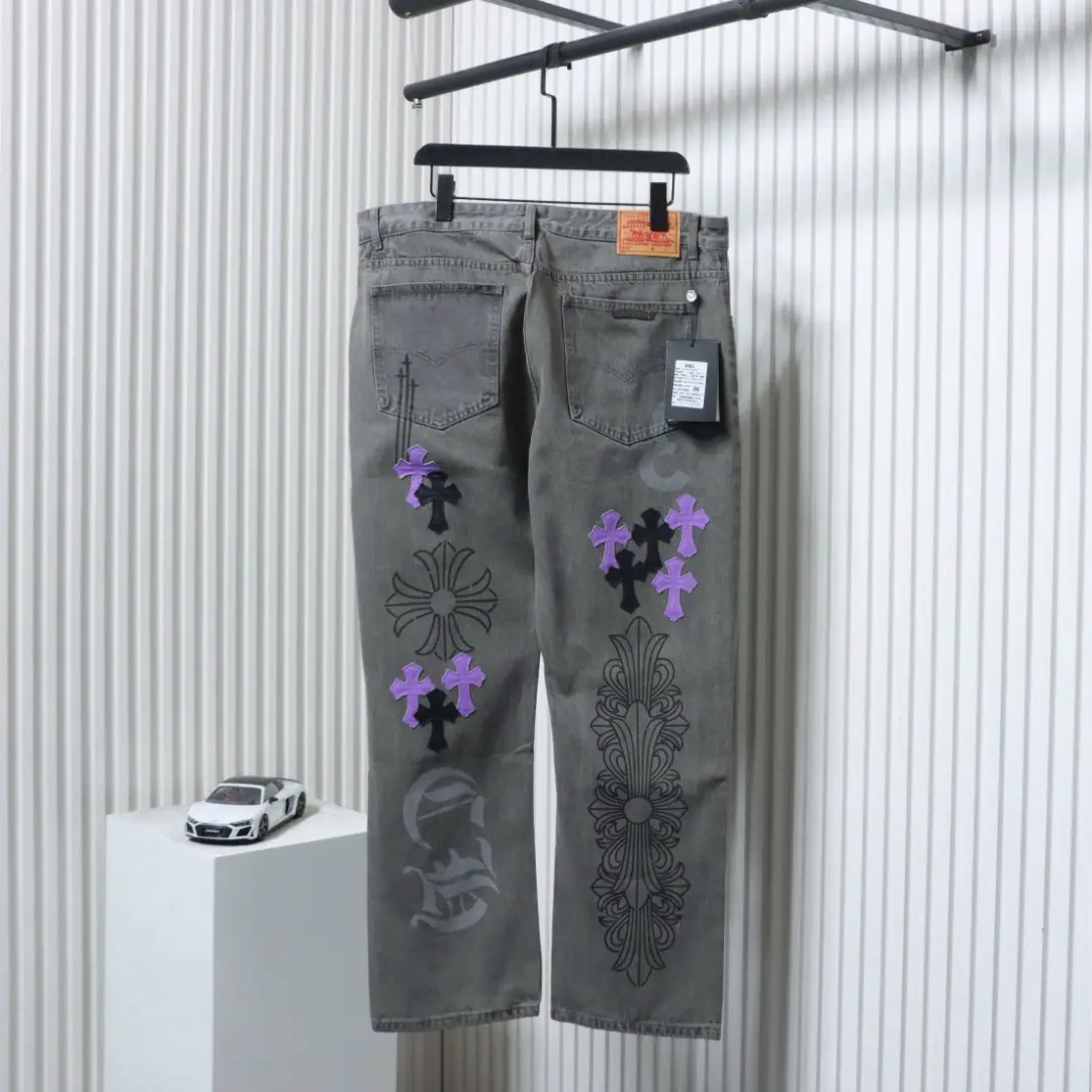 Lilafarbene Jeans aus Patchwork-Leder mit Graffiti-Sprühfarbe in limitierter Auflage