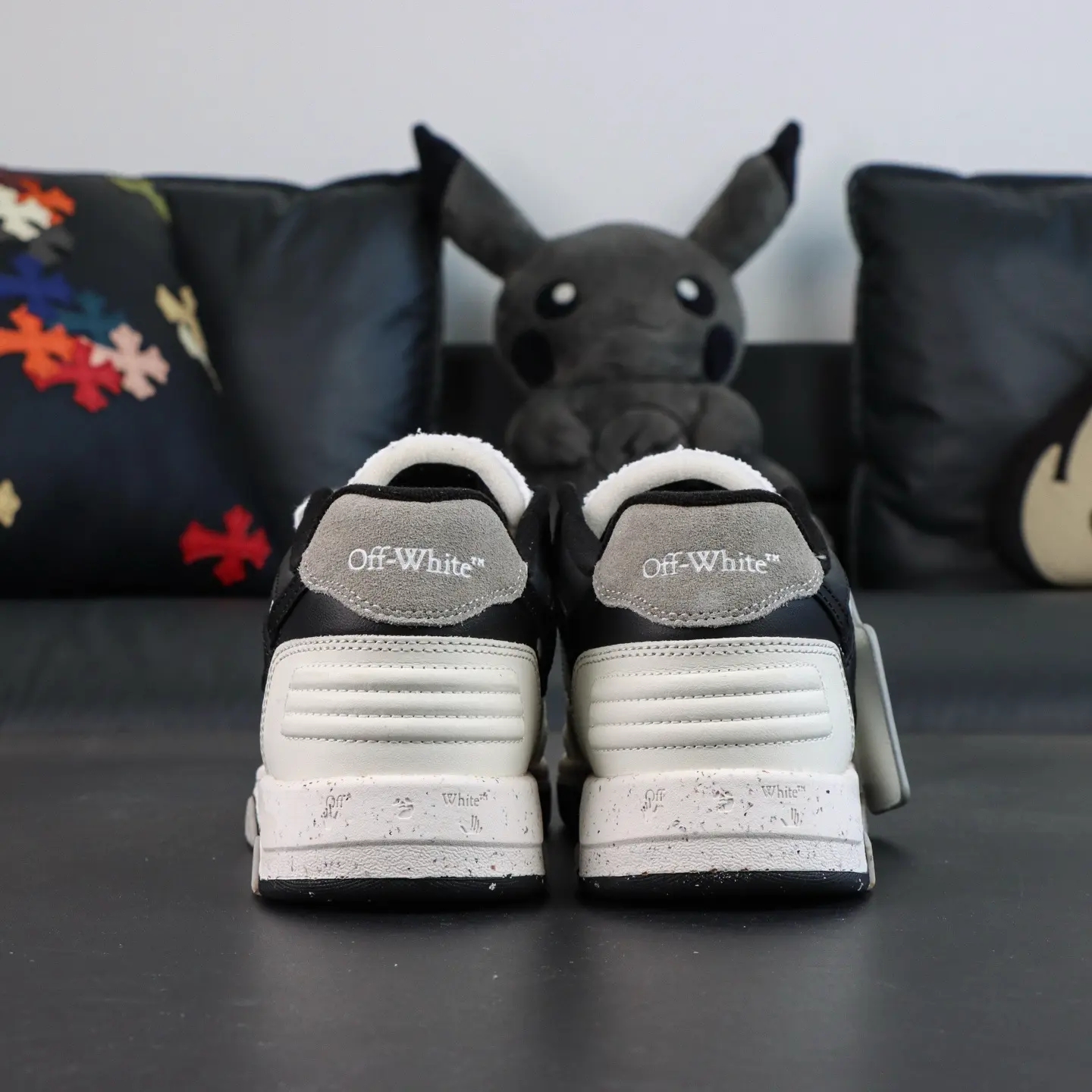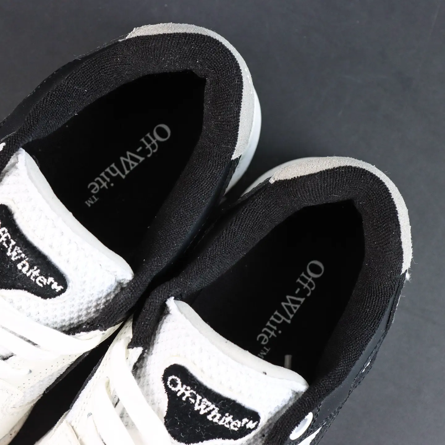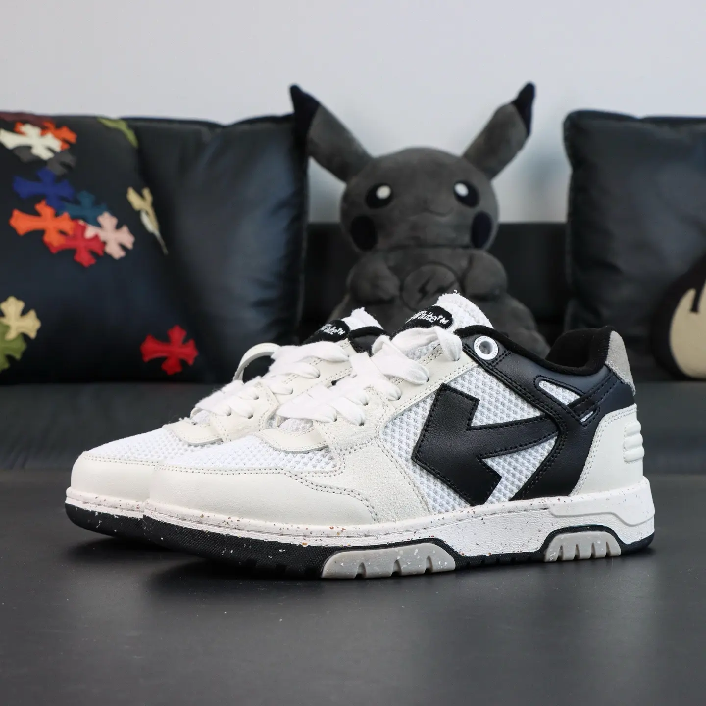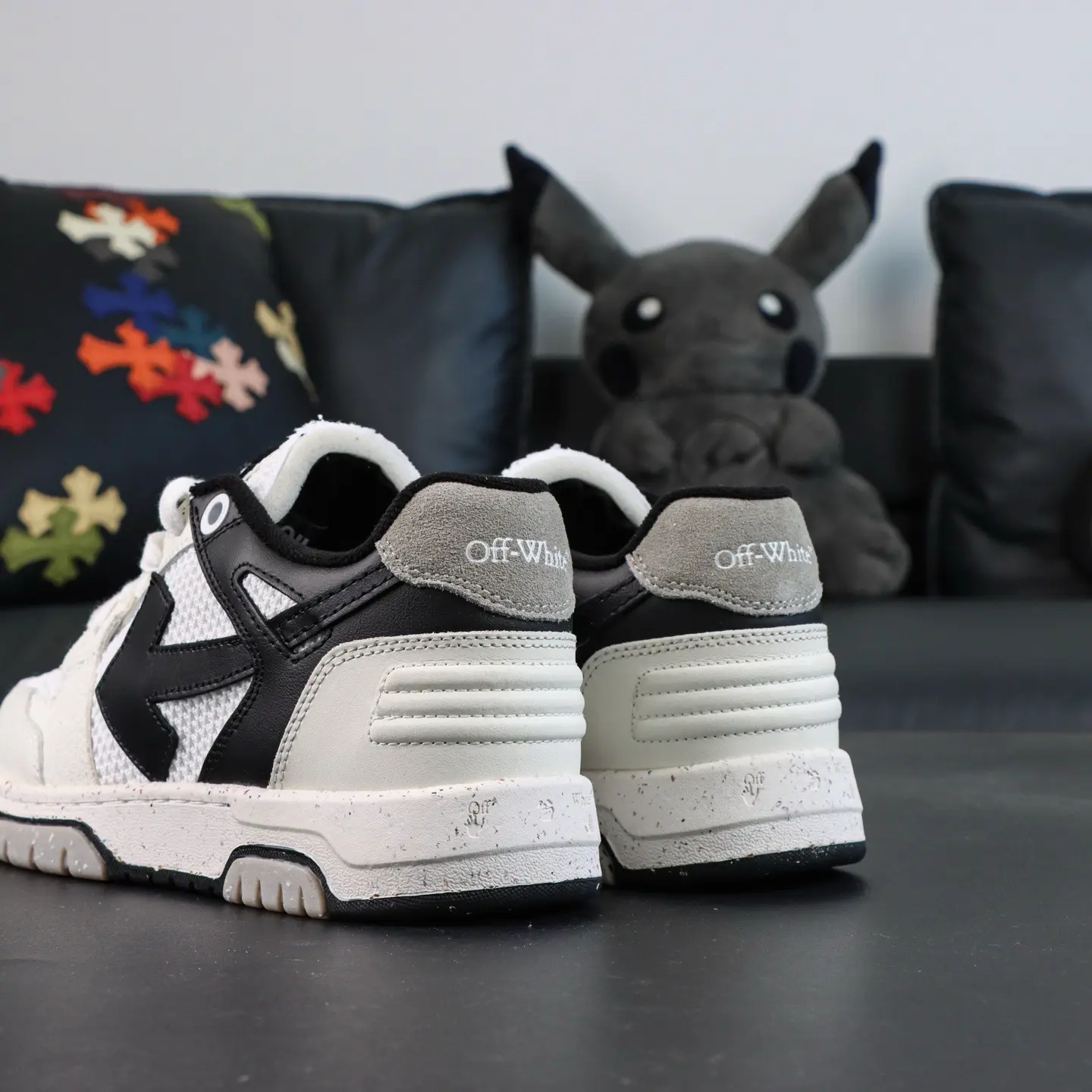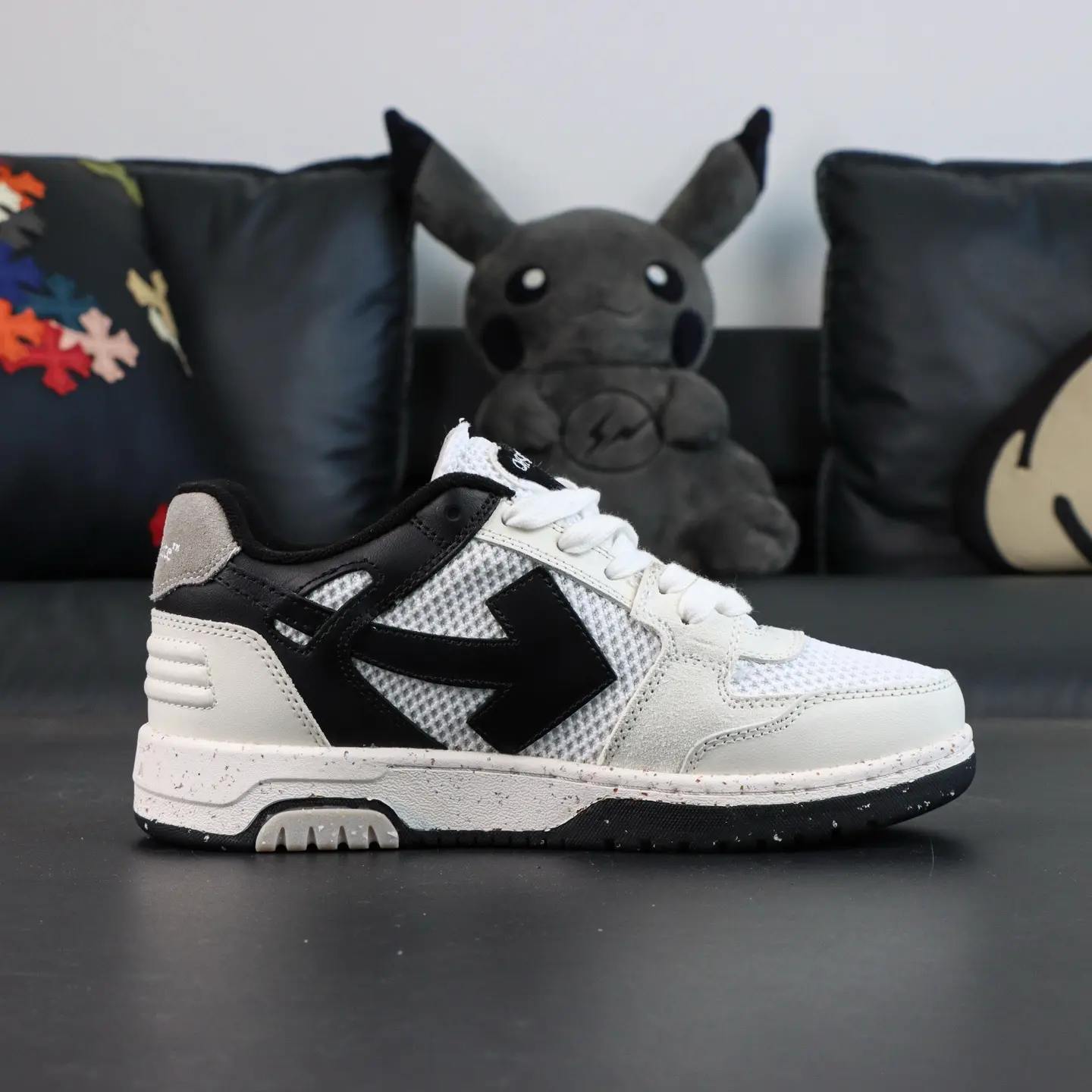 OFF-WHITE Out Of Office Leder-Sneaker, Weiß/Grau/Schwarz, Pfeil-Design, Top-Sneaker