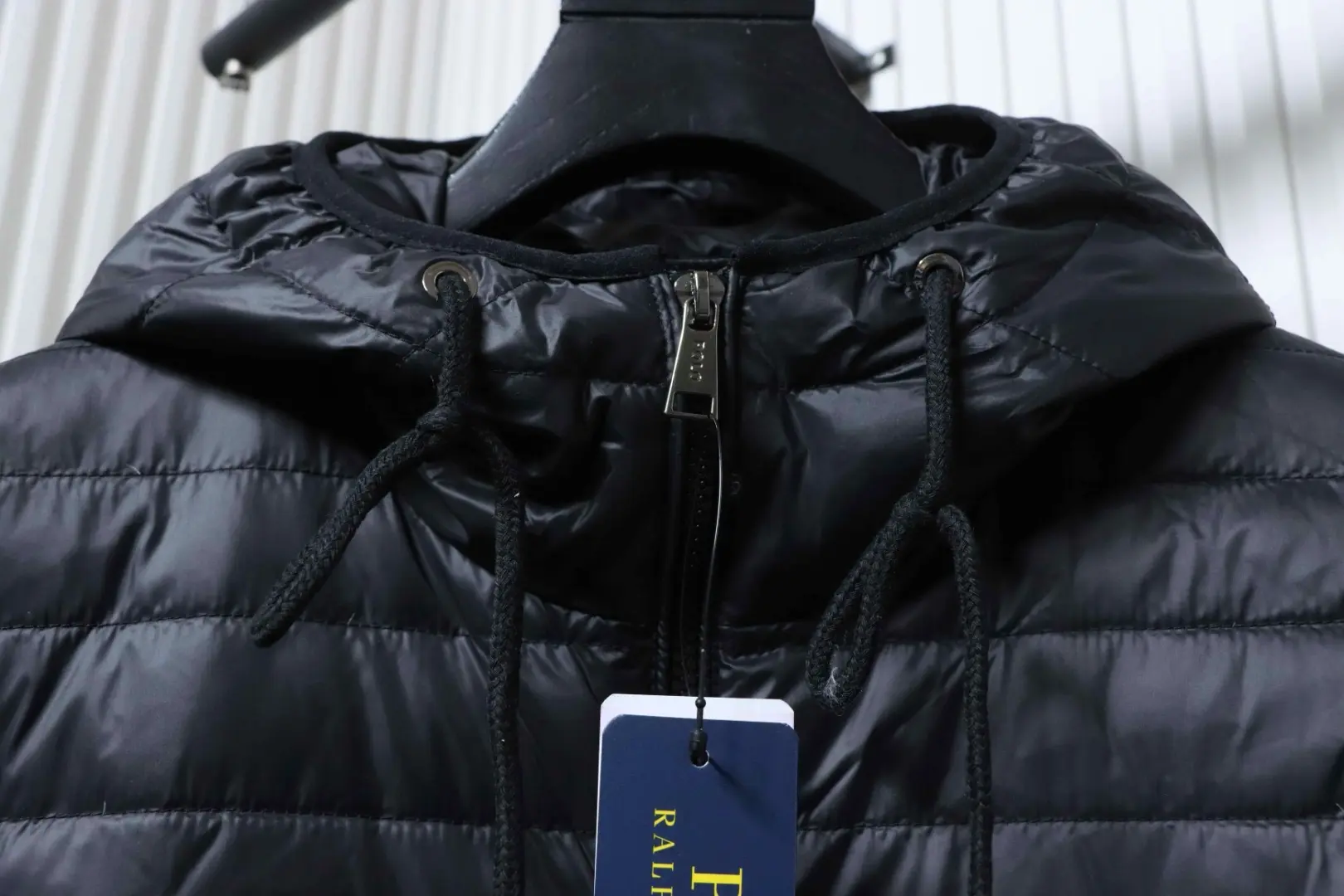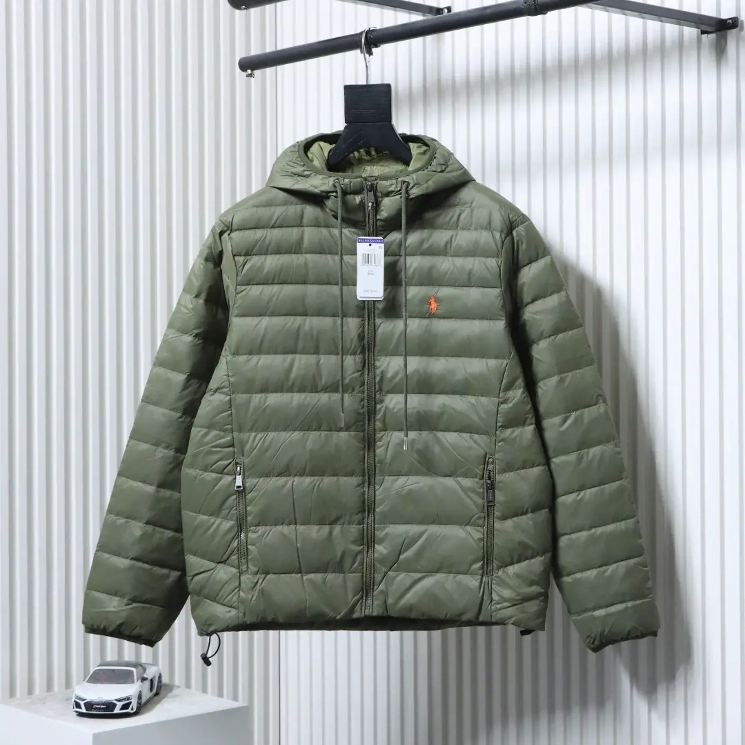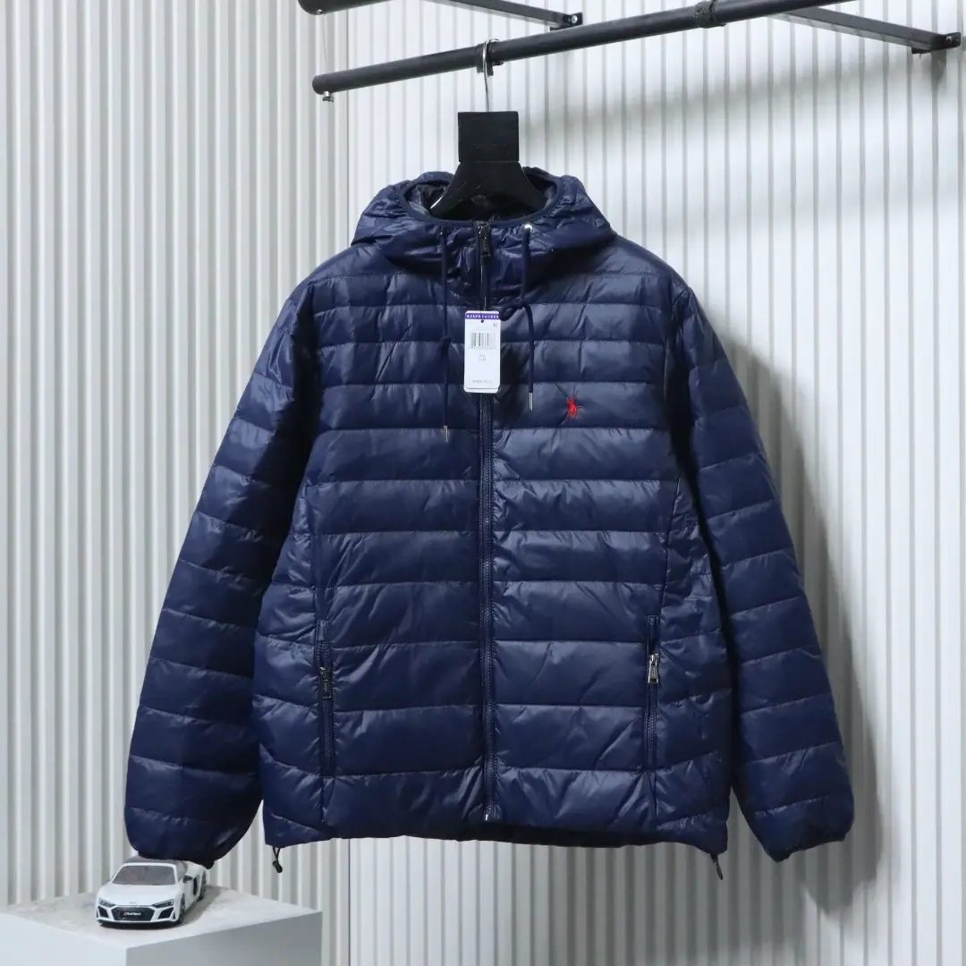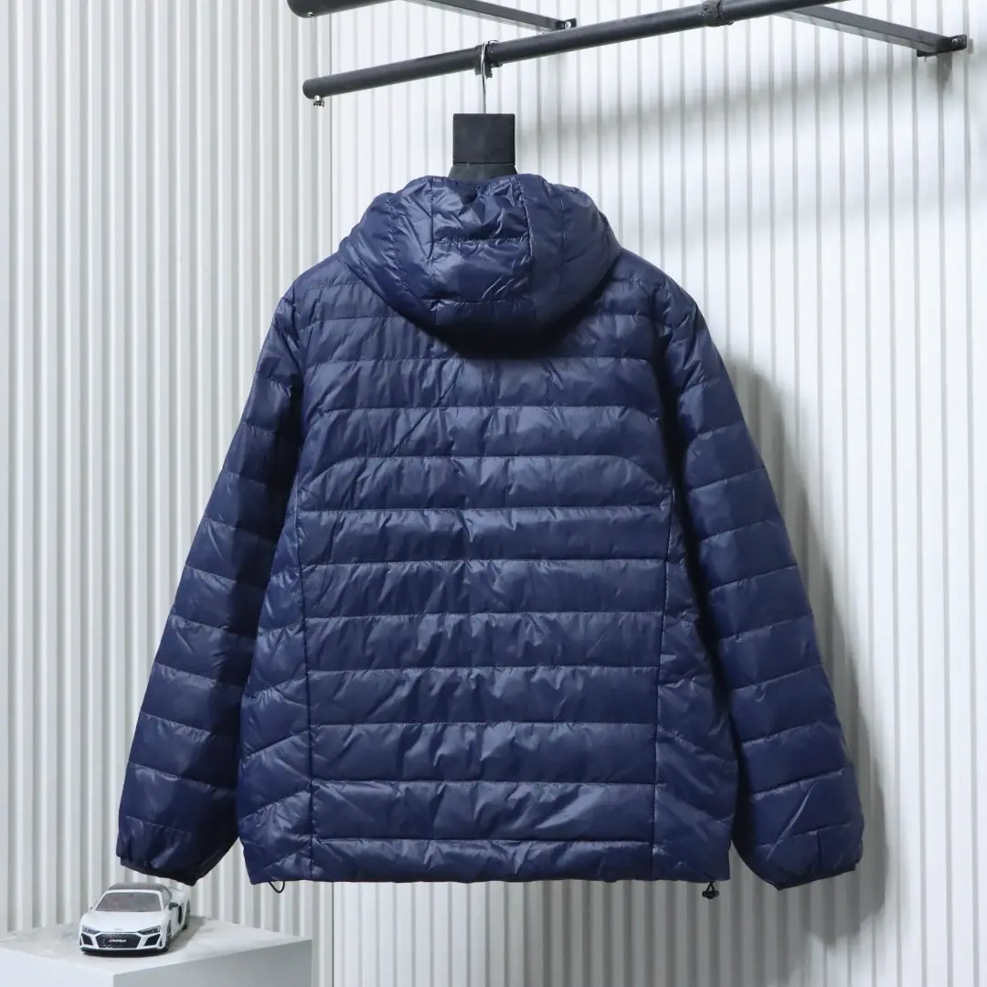 Metallenes Dreieckslogo, Daunenjacke mit Kapuze und breiter Krempe