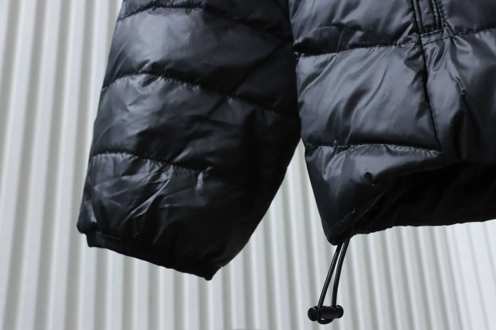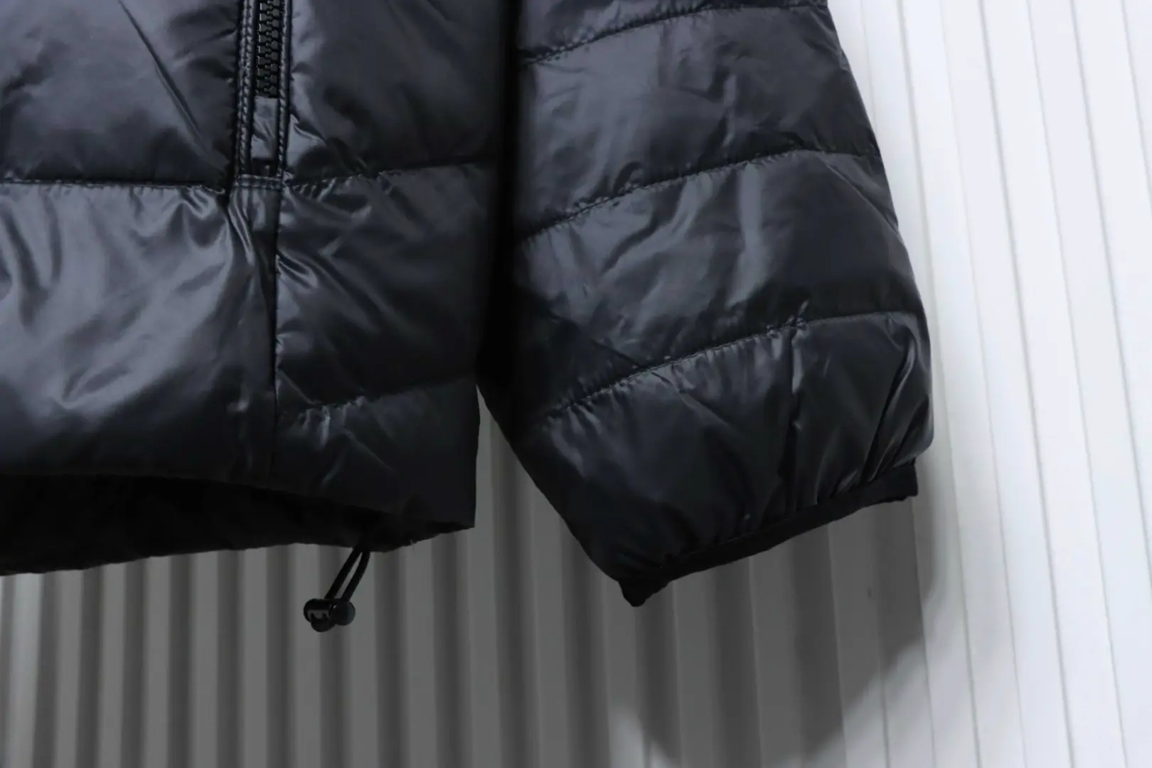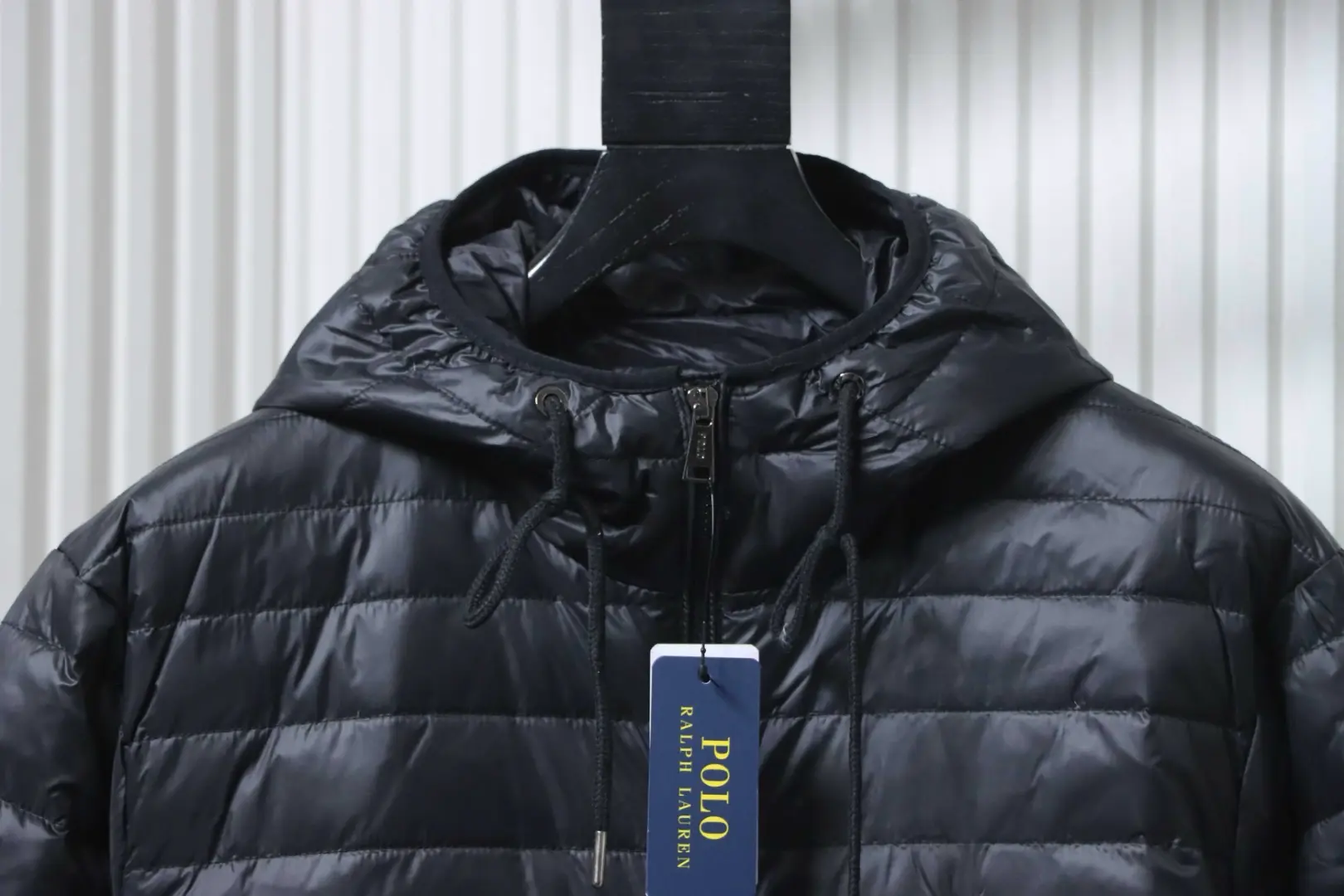 Metallenes Dreieckslogo, Daunenjacke mit Kapuze und breiter Krempe