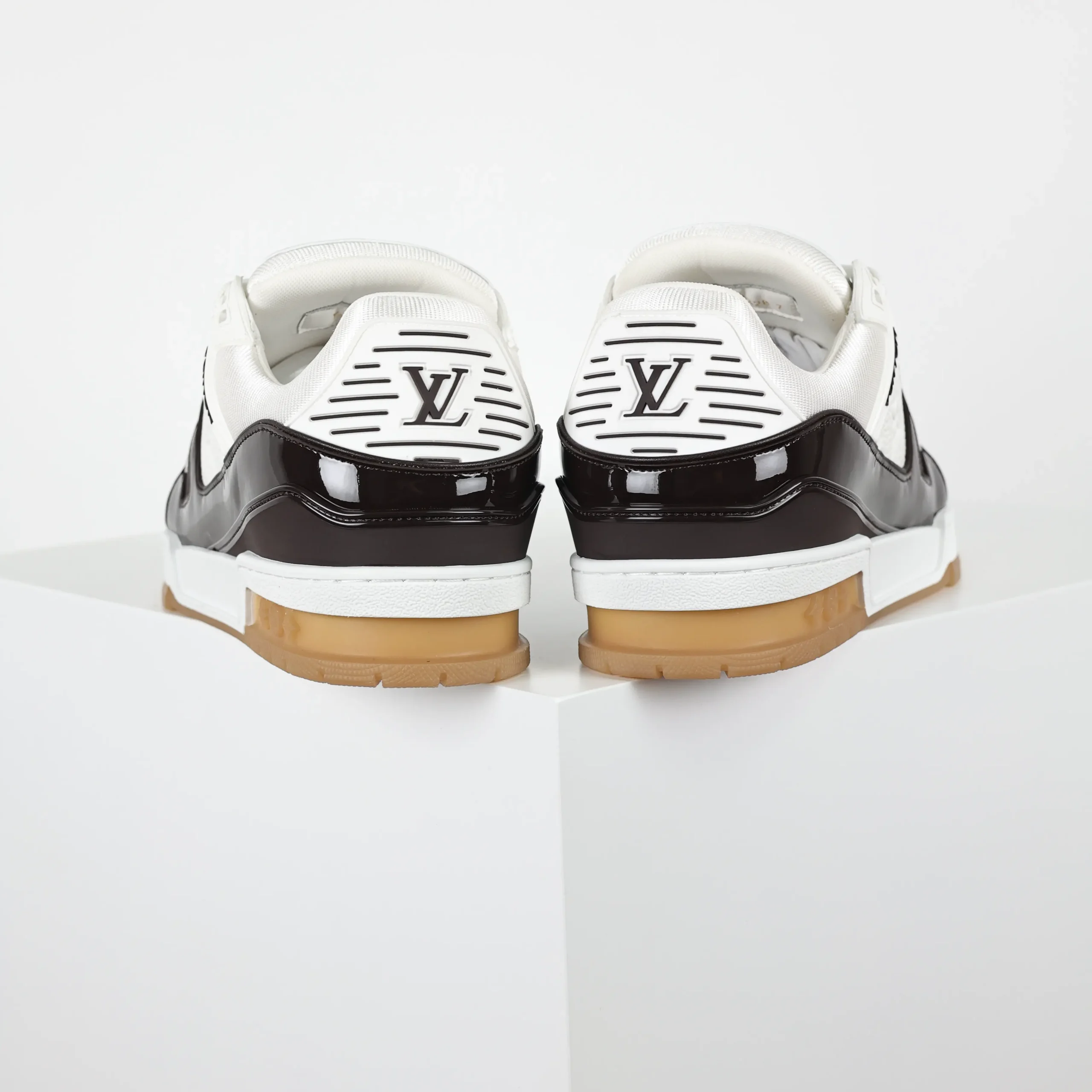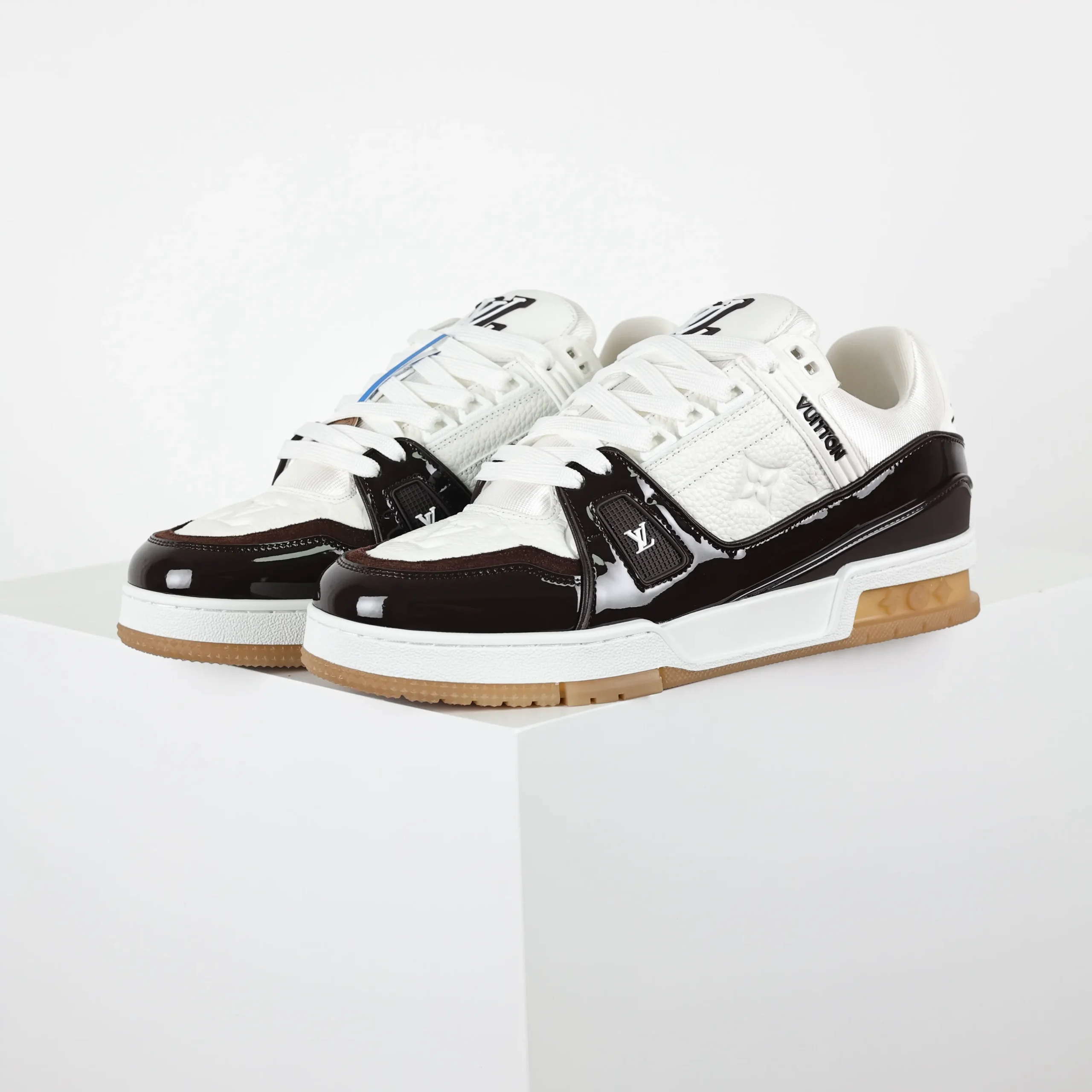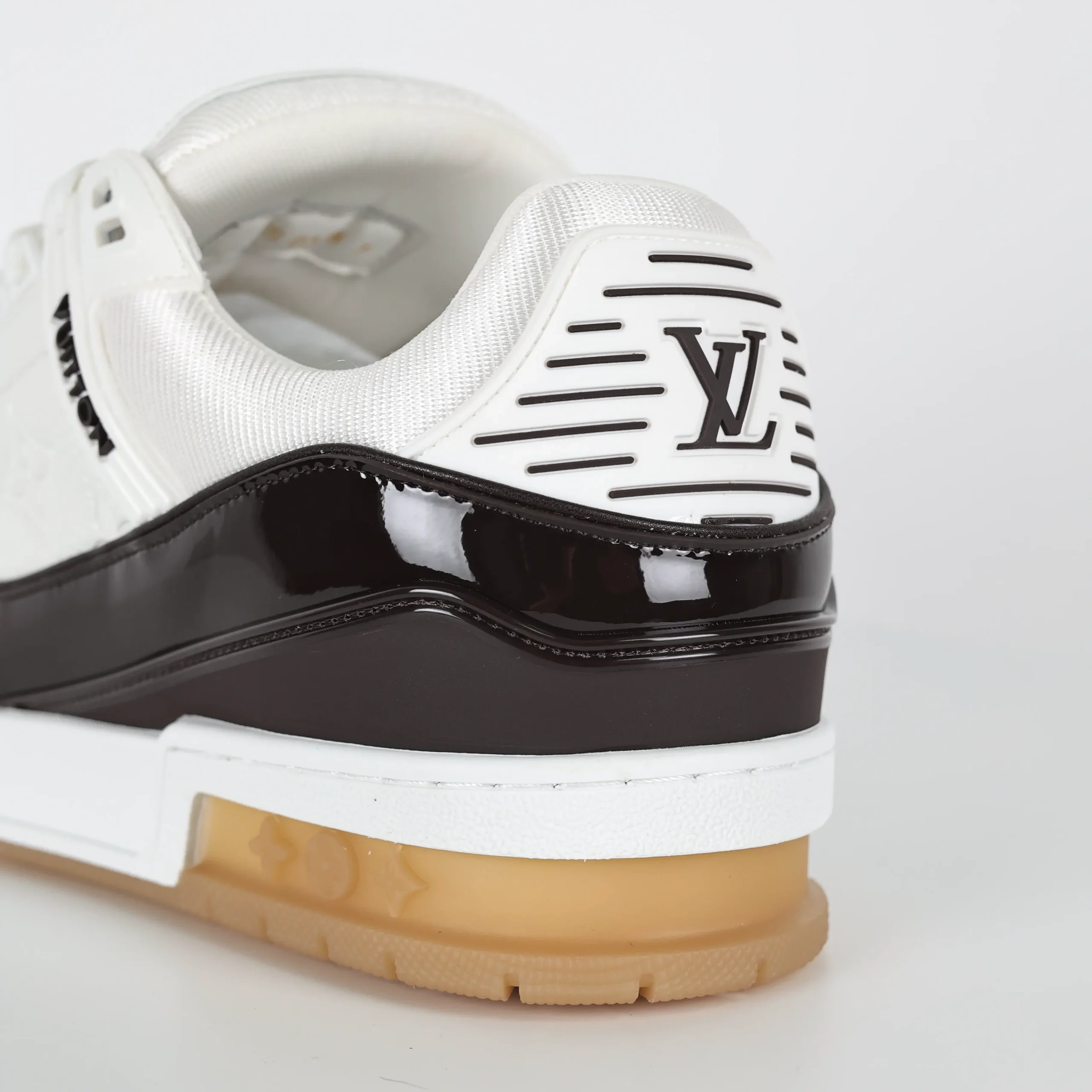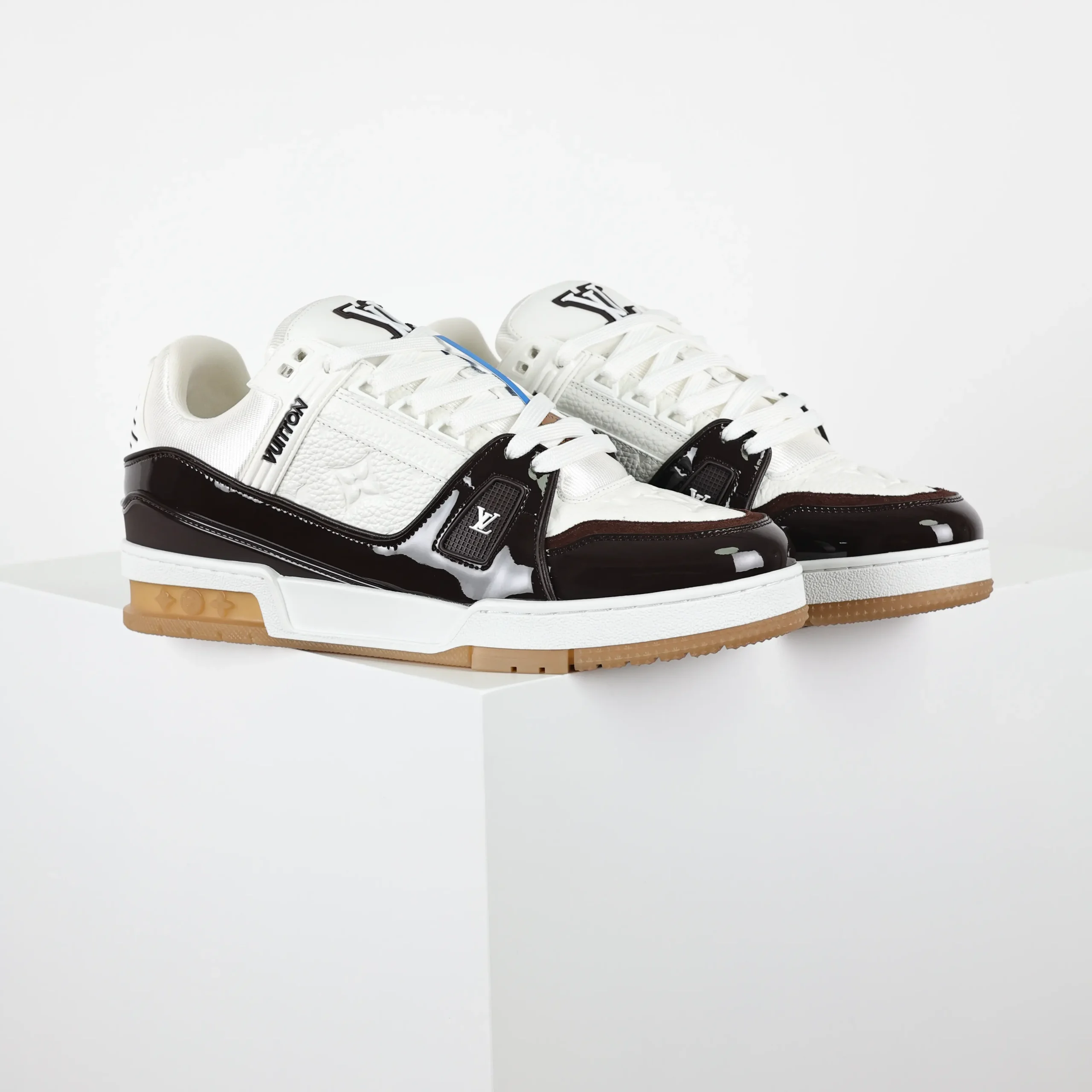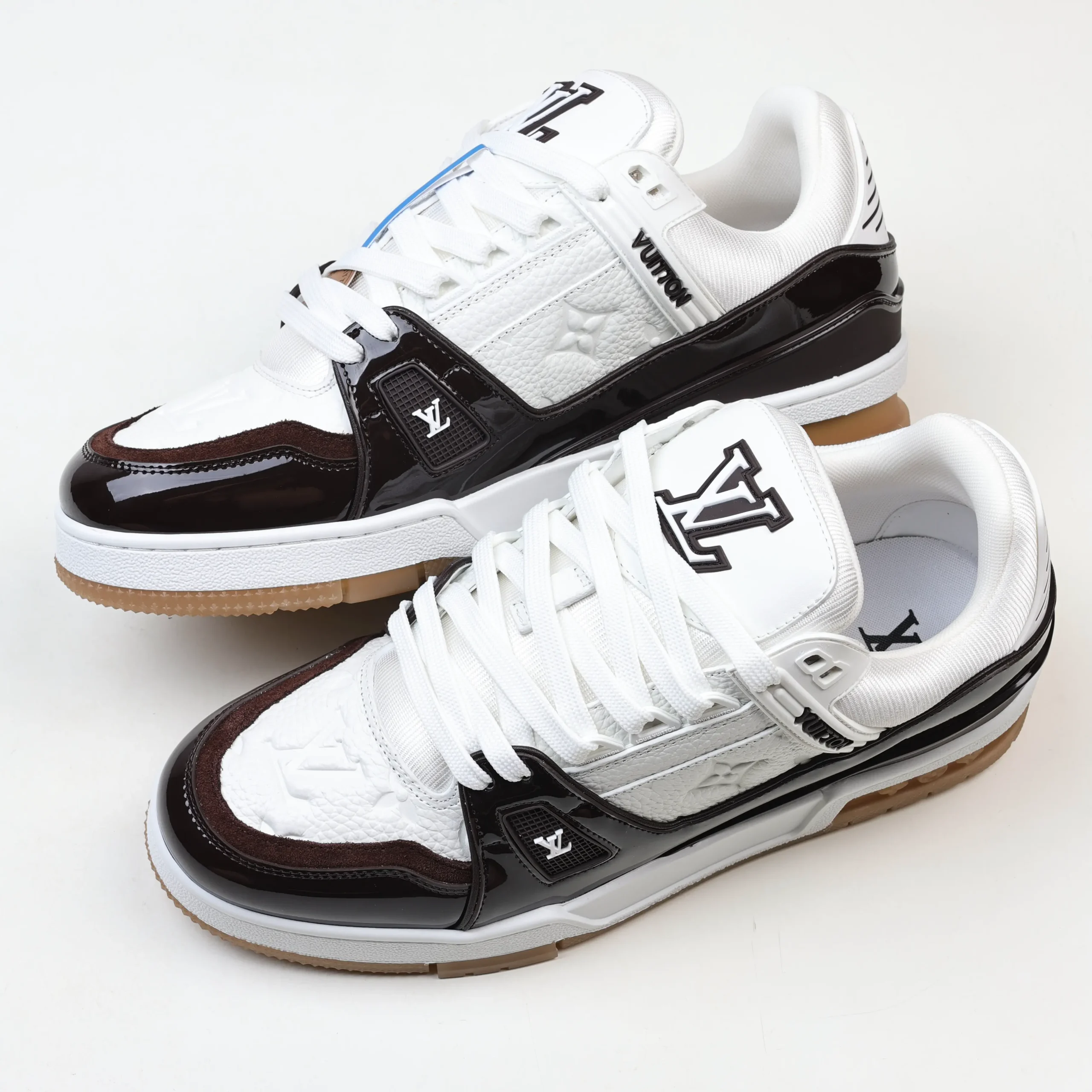 Trainer Monogram Sneakers aus weißem genarbtem Kalbsleder und schwarzem Lackleder