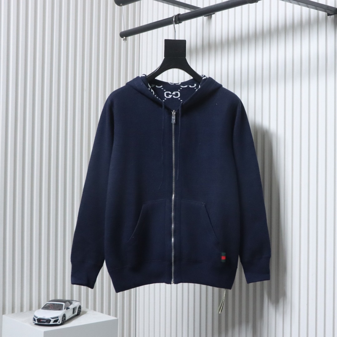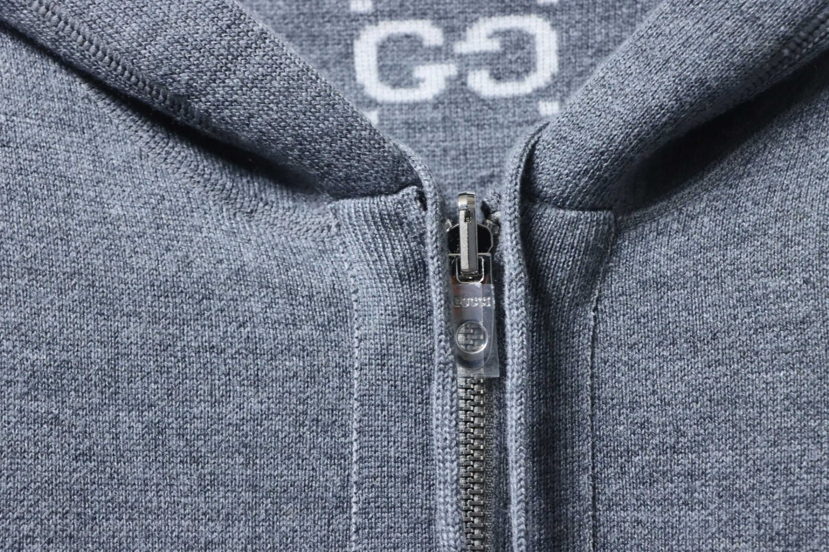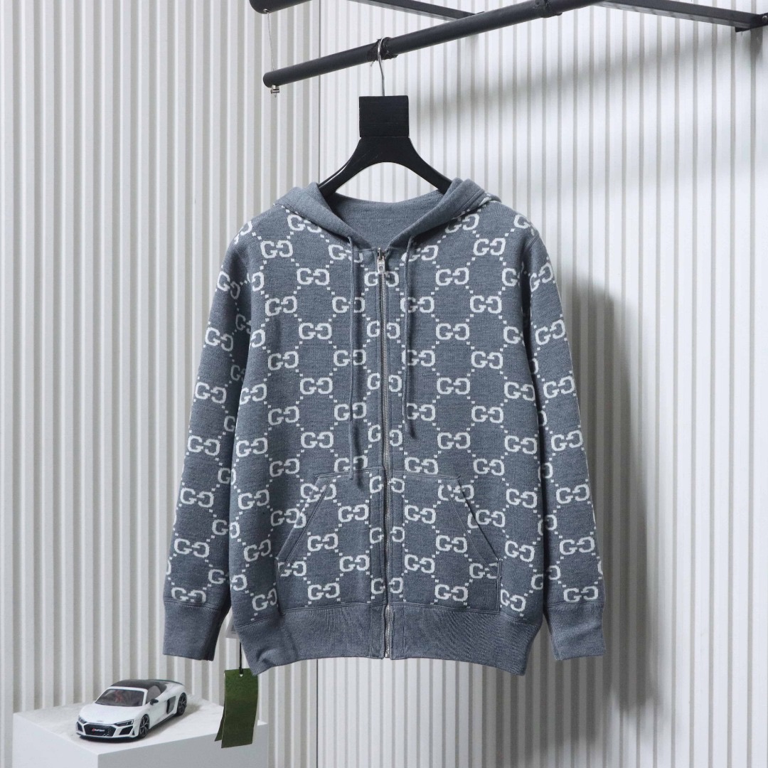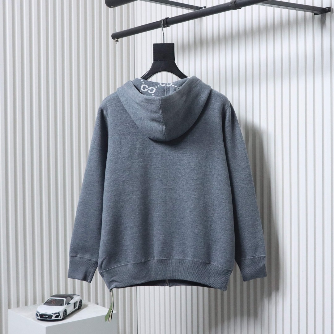 - Eine Seite besteht aus grauem, doppellagigem Wollstrick, die andere aus grau-weißem GG-Wollstrick. Die Jacke verfügt über eine feste Kapuze mit Kordelzug, und das GG-Motiv erscheint in einer Vielzahl einzigartiger Farben und Kombinationen, von Leinenmischungen bis hin zu Nylon.