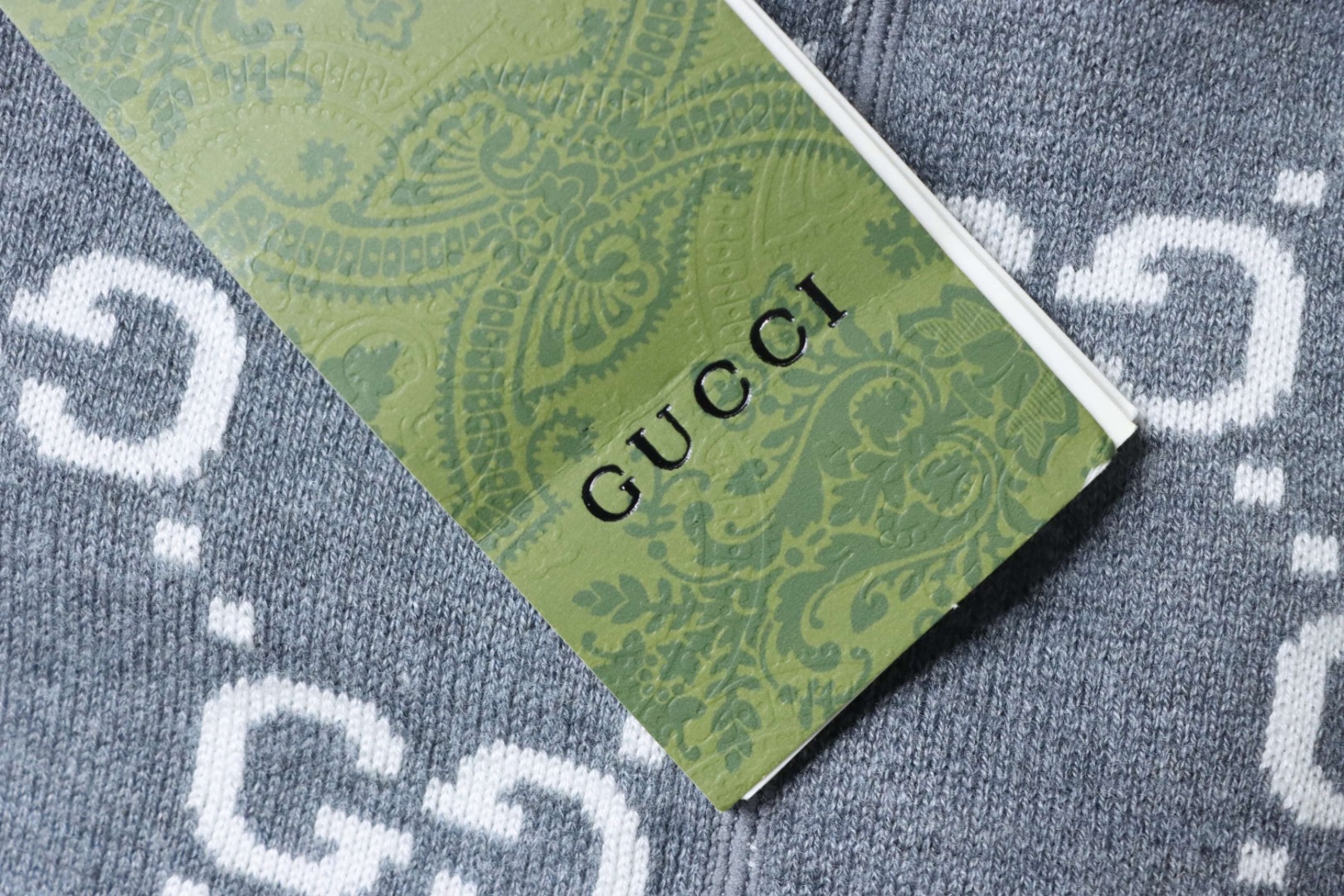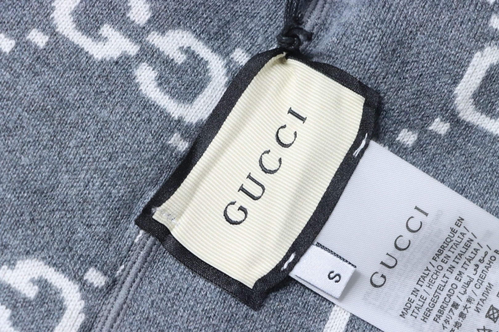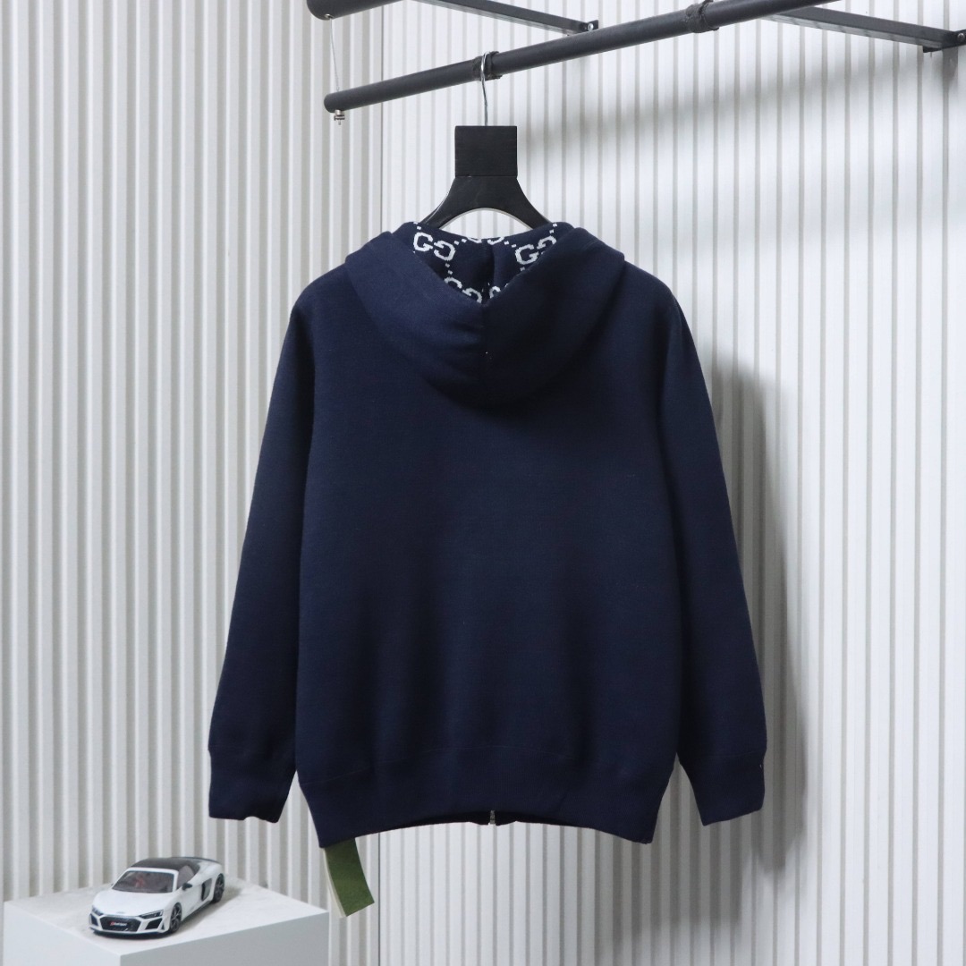 - Eine Seite besteht aus grauem, doppellagigem Wollstrick, die andere aus grau-weißem GG-Wollstrick. Die Jacke verfügt über eine feste Kapuze mit Kordelzug, und das GG-Motiv erscheint in einer Vielzahl einzigartiger Farben und Kombinationen, von Leinenmischungen bis hin zu Nylon.