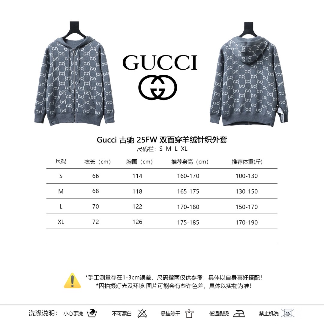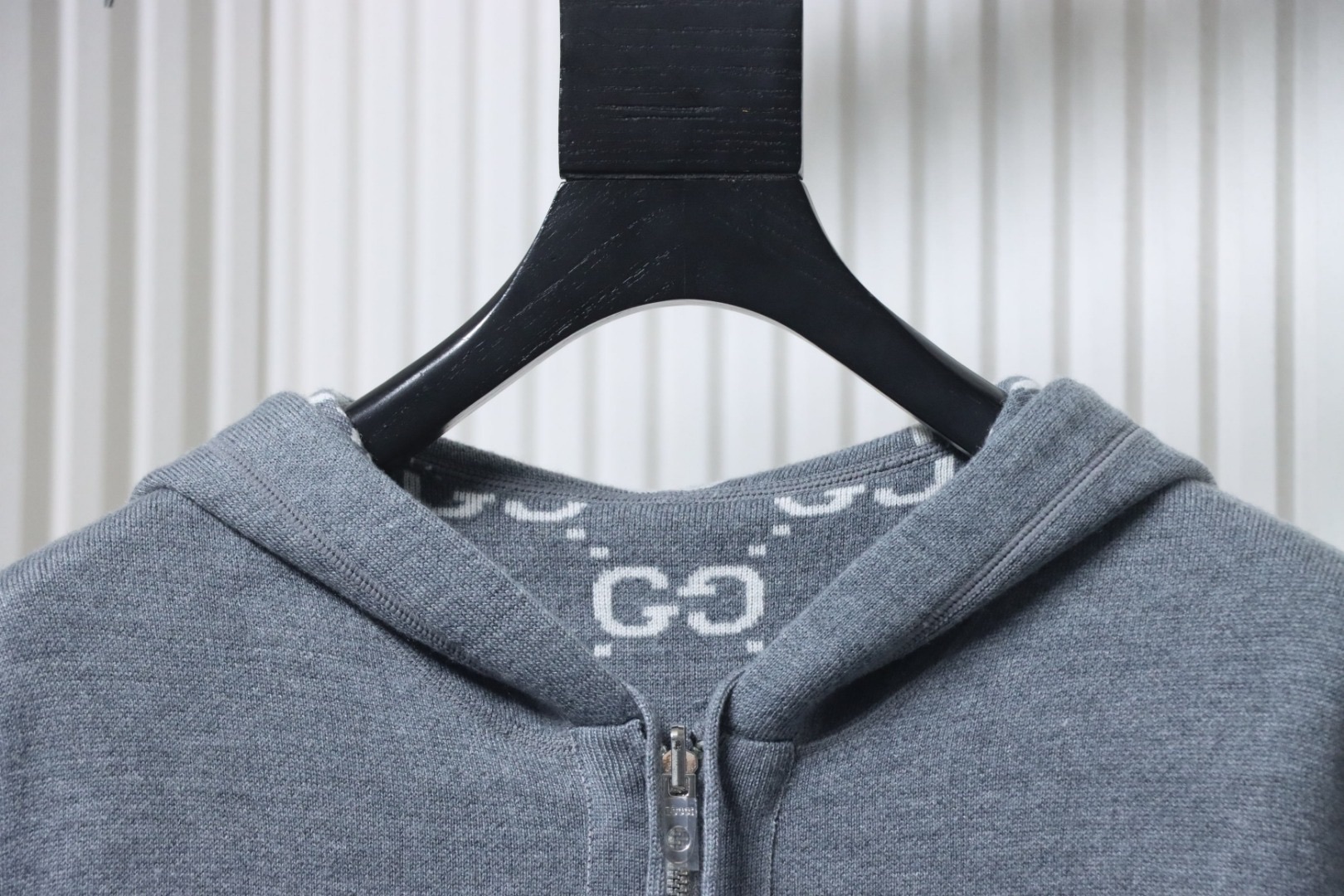- Diese wendbare Reißverschlussjacke ist auf der einen Seite aus grauer Wolle und auf der anderen aus leuchtender GG-Wolle gefertigt.